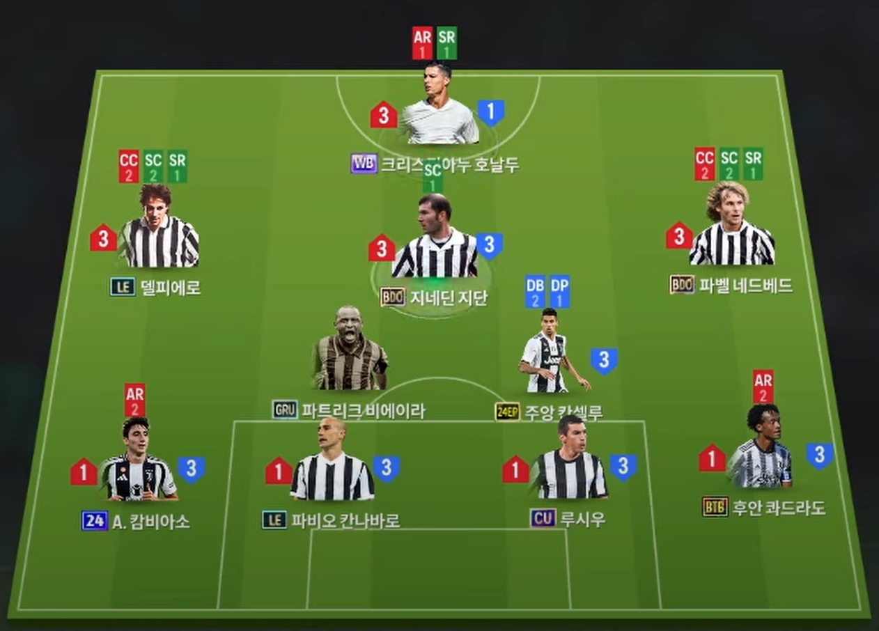 Sơ đồ 4-2-2-1-1 được áp dụng với Cristiano Ronaldo đá cao nhất trên hàng công – mẫu trung phong toàn diện nhất trong team color Juventus. Hỗ trợ ngay phía sau là Zidane, nhạc trưởng giàu sáng tạo và đa năng trong cả chuyền bóng, rê dắt lẫn dứt điểm. Hai bên cánh là Del Piero và Nedvěd, những cầu thủ mang lại tốc độ, khả năng xâm nhập cũng như sút xa hiệu quả.