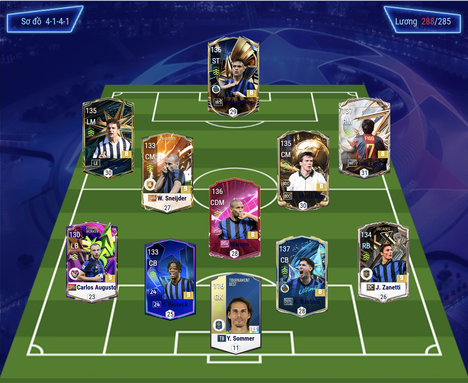 Trong game, Inter sở hữu một cấu trúc đội hình cân bằng, nơi sức mạnh thể chất, tốc độ và khả năng đọc tình huống đều được khai thác tối đa. Từ các trung vệ mạnh mẽ, tiền vệ thu hồi bóng giàu tính chiến đấu, cho đến những tiền đạo hoàn thiện trong khâu dứt điểm – tất cả tạo nên tập thể bền bỉ ở phòng ngự và đáng sợ khi chuyển trạng thái.