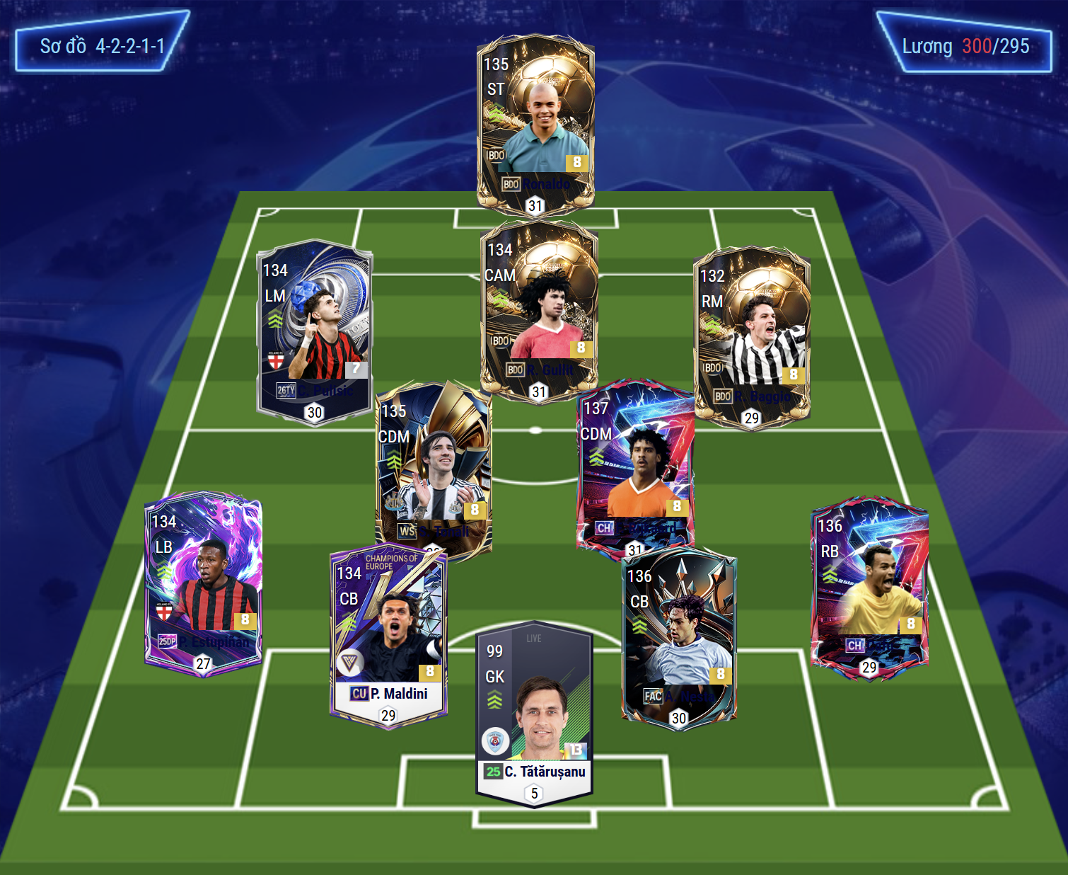 Sơ đồ 4-2-2-1-1 được lựa chọn với vị trí tiền đạo cắm là Ronaldo de Lima – mẫu trung phong toàn diện với tốc độ, kỹ năng xử lý và khả năng dứt điểm hiệu quả bằng cả hai chân, mang lại sự khác biệt rõ rệt trong những tình huống quyết định. Hỗ trợ phía sau là Gullit, thi đấu như một hộ công tự do, đóng vai trò kết nối tuyến giữa và hàng công, đồng thời trực tiếp tham gia vào các pha dứt điểm khi có khoảng trống.