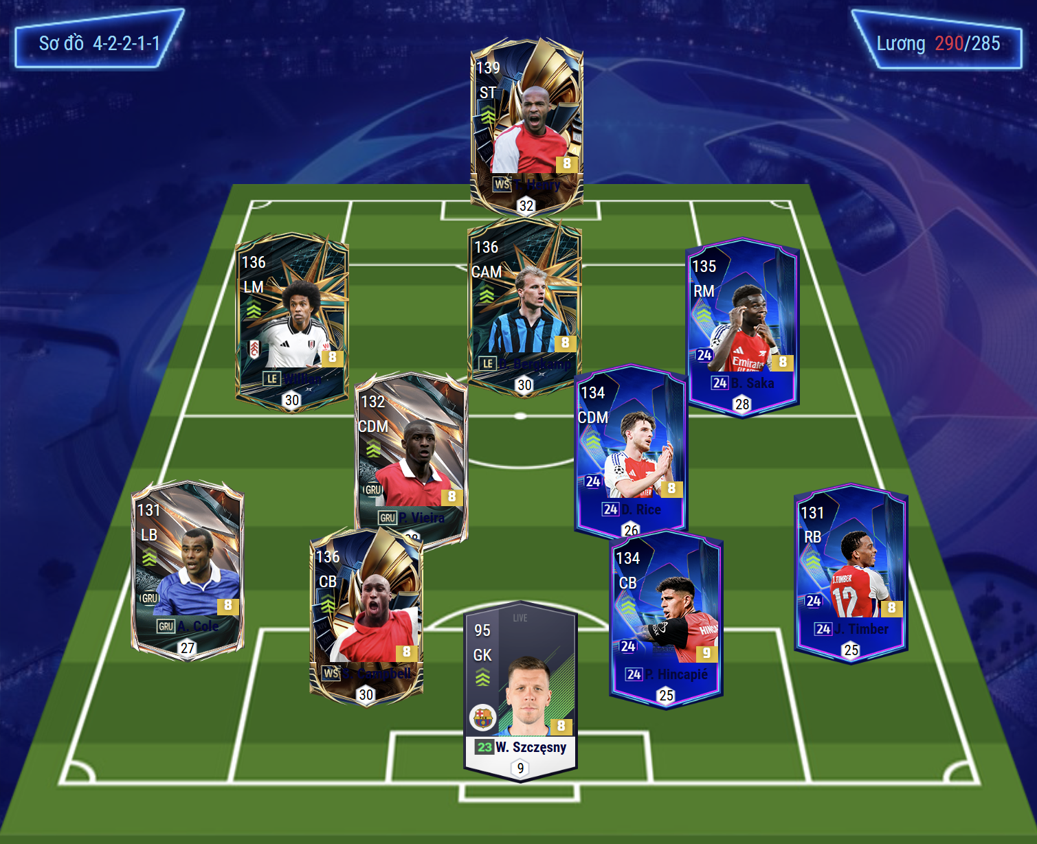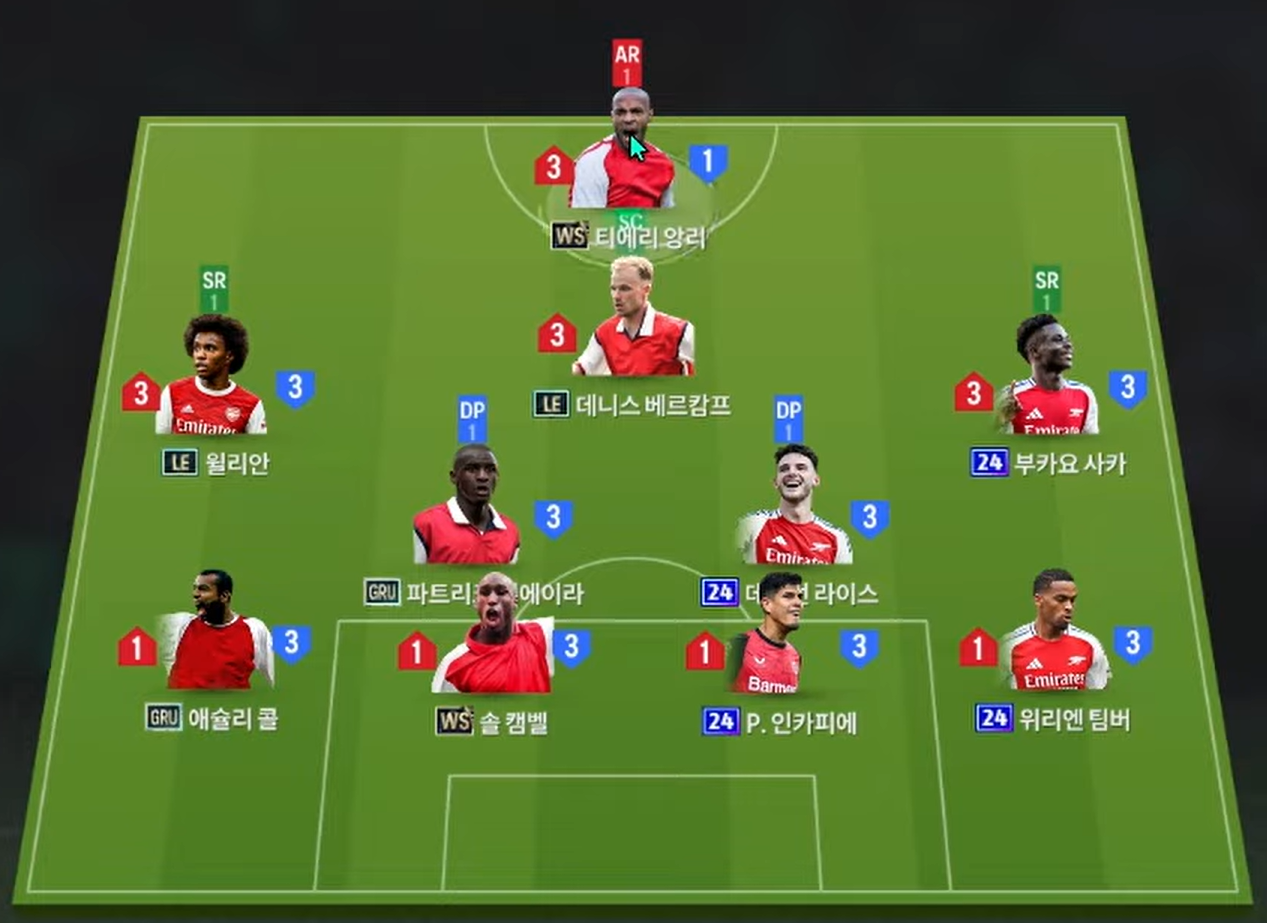 Sơ đồ 4-2-2-1-1 được lựa chọn với Henry là tiền đạo cắm – trung phong toàn diện bậc nhất, sở hữu khả năng dứt điểm, di chuyển thông minh và khai thác không gian cực tốt. Bergkamp đảm nhận vị trí tiền vệ hộ công, hot pick hiện tại nhờ khả năng chuyền bóng tinh tế và sút xa cực chất. Hai cánh là Willian và Saka, bộ đôi tốc độ, phối hợp tốt, vừa có khả năng tạt bóng, chuyền cắt vào vòng cấm vừa sẵn sàng dứt điểm khi có cơ hội.