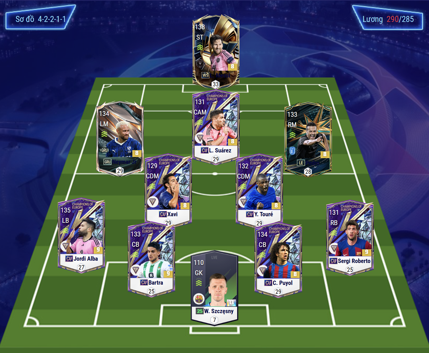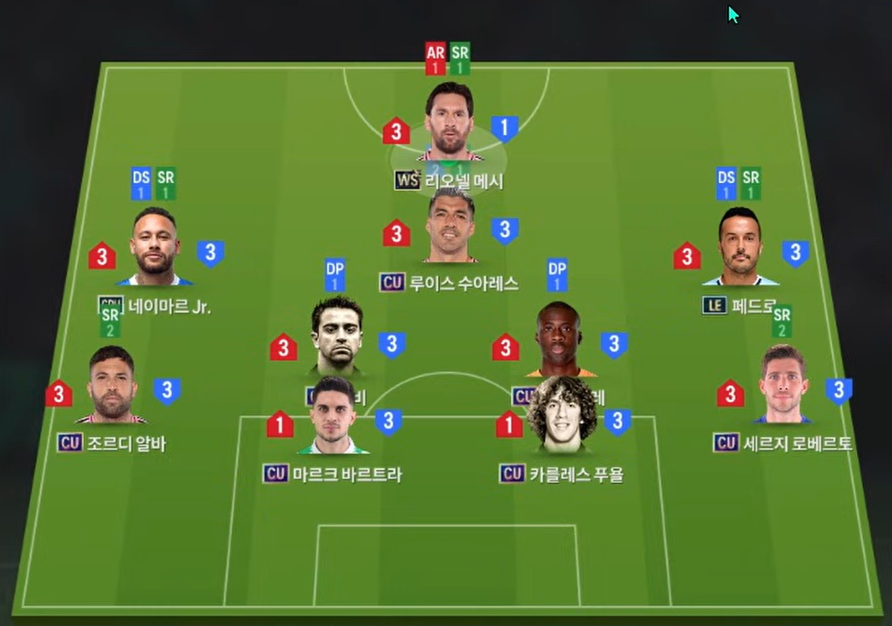Sơ đồ 4-2-2-1-1 được sử dụng cho team color Barcelona, phù hợp với nhiều meta gameplay khác nhau. Ở vị trí tiền đạo cắm, Messi được tin dùng như một trung phong ảo thực thụ. Huyền thoại người Argentina sở hữu tốc độ, khả năng dứt điểm sắc bén cùng kỹ năng rê dắt và phối hợp cực kỳ ấn tượng, cho phép hàng công vận hành linh hoạt và biến hóa. Đá ngay phía sau, Suarez đảm nhiệm vai trò tiền vệ công với khả năng xâm nhập vòng cấm thông minh, hỗ trợ ghi bàn hiệu quả, đồng thời đóng góp lớn trong khâu liên kết, xử lý bóng và thu hút hàng thủ đối phương.