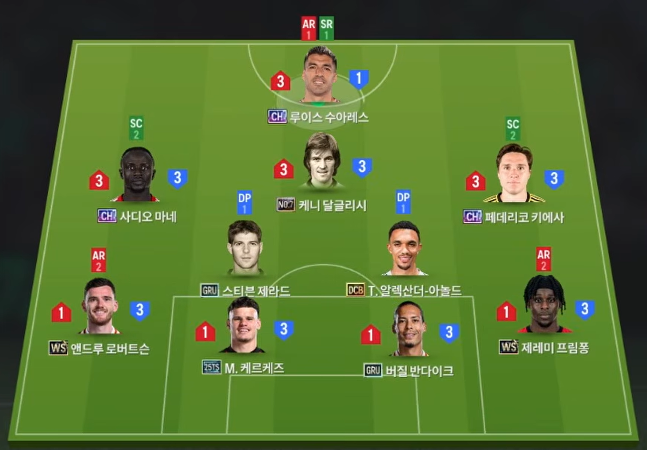 Sơ đồ 4-2-2-1-1 được lựa chọn cho team color Liverpool với Luis Suárez đảm nhiệm vai trò tiền đạo cắm. Tiền đạo người Uruguay nổi bật với khả năng di chuyển thông minh, dứt điểm sắc bén bằng cả hai chân và sự nguy hiểm trong mọi tình huống xử lý trong vòng cấm lẫn ngoài vòng cấm. Chơi phía sau Suárez là Kenny Dalglish trong vai trò hộ công (CAM). Huyền thoại người Scotland sở hữu khả năng chuyền bóng tinh tế, dứt điểm hiệu quả cùng kỹ năng rê dắt và di chuyển thông minh, giúp kết nối lối chơi và tạo ra nhiều cơ hội cho tuyến trên.