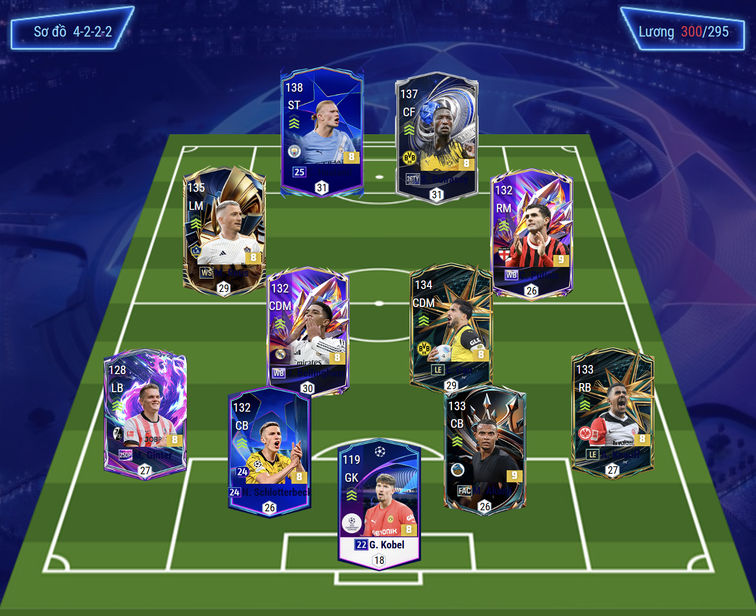 Sơ đồ 4-2-2-2 được lựa chọn, tối ưu hóa khả năng tấn công trực diện và chuyển trạng thái nhanh. Trên hàng công, bộ đôi Haaland và Guirassy đóng vai trò mũi nhọn với thể hình, sức mạnh cùng khả năng dứt điểm sắc bén. Cả hai không chỉ tận dụng tốt cơ hội trong vòng cấm mà còn gây áp lực liên tục lên hàng thủ đối phương bằng những pha di chuyển thông minh.