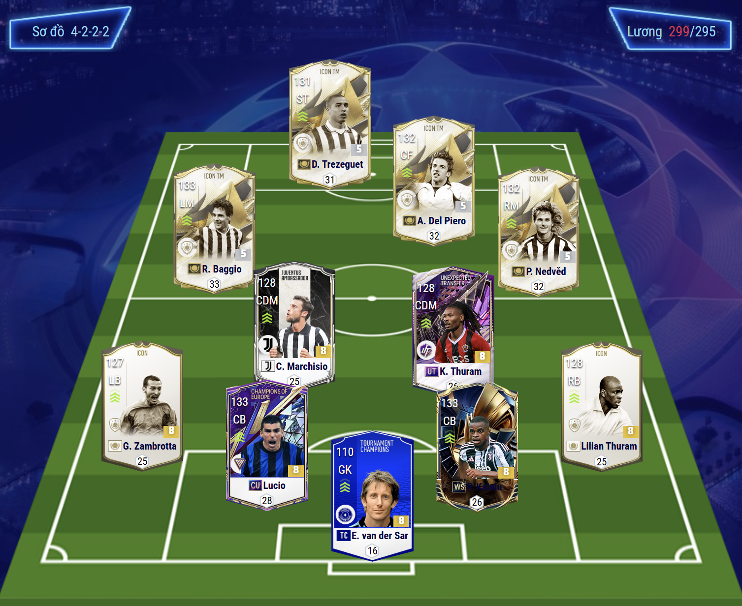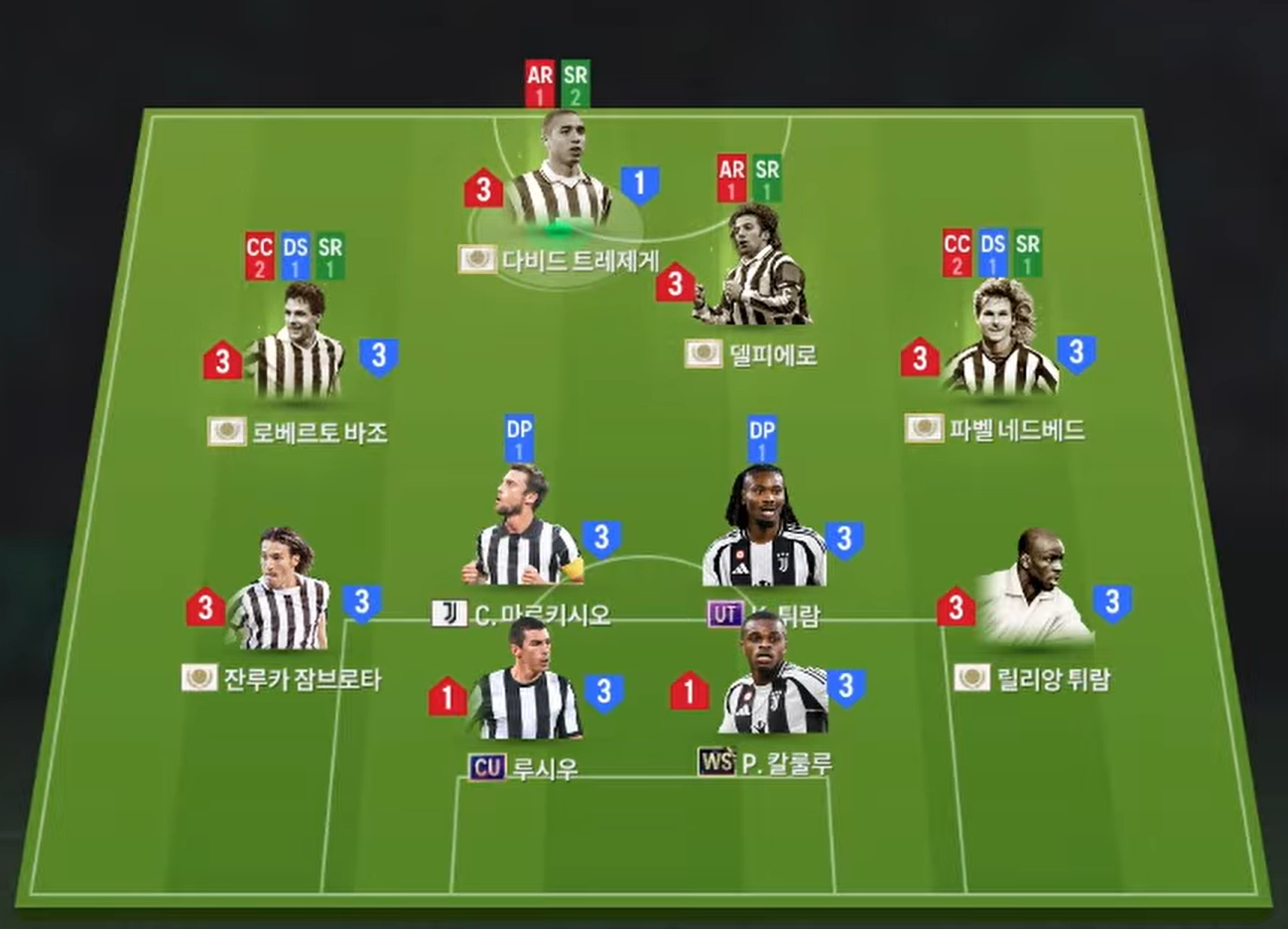 Hai hành lang cánh được đảm nhiệm bởi Roberto Baggio và Pavel Nedvěd. Cả hai đều sở hữu kỹ thuật tốt, khả năng chuyền tạt, sút xa hiệu quả bằng cả hai chân, mang lại sự đa dạng trong các phương án tiếp cận khung thành. Ở tuyến giữa, Claudio Marchisio và Lilian Thuram tạo thành cặp tiền vệ trung tâm đa năng. Bộ đôi này đảm bảo khả năng tranh chấp, hỗ trợ phòng ngự, điều tiết nhịp độ và tham gia tấn công khi cần thiết.