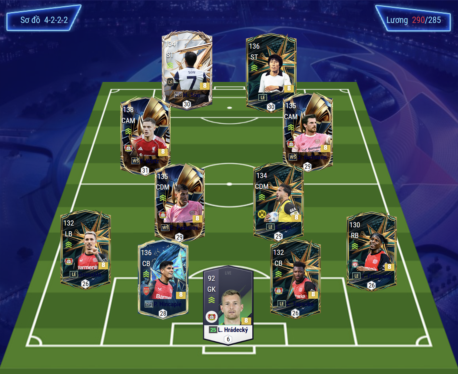 Họ không chơi bóng bằng danh tiếng, mà bằng cường độ, niềm tin và sự gắn kết trong từng pha xử lý. Trong FC Online, Bayer Leverkusen đại diện cho thứ bóng đá giàu biến hóa và bùng nổ. Đội hình ưu tiên tốc độ, khả năng pressing tầm cao và chuyển trạng thái nhanh, tạo ra cảm giác tấn công liên tục và áp lực không ngừng lên đối thủ. Đây là lựa chọn lý tưởng cho những người chơi yêu thích sự nhiệt huyết, chủ động và một chút nổi loạn trong phong cách triển khai lối chơi.