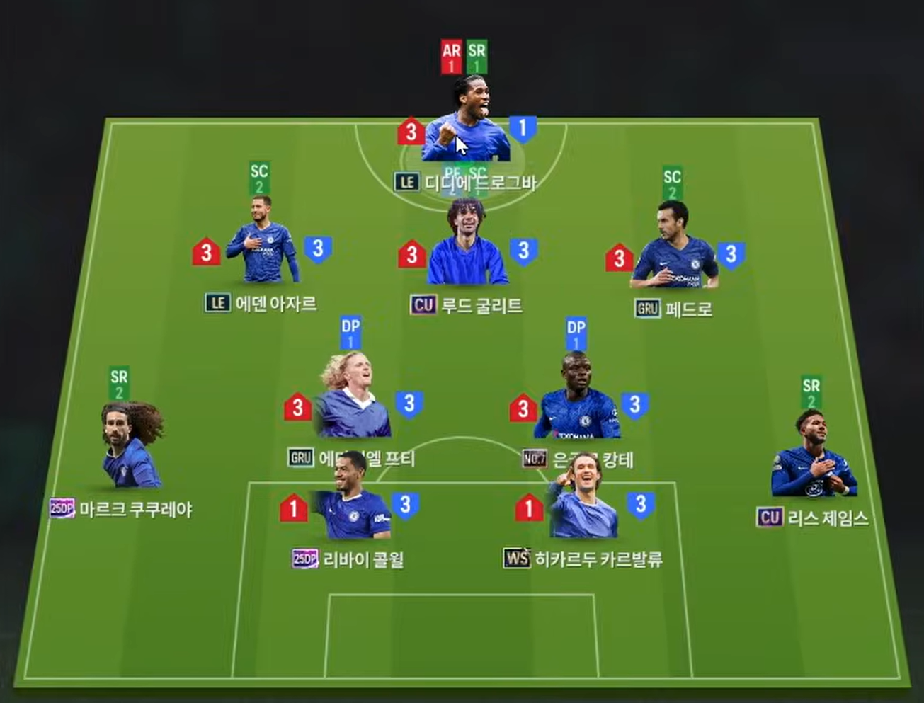 Sơ đồ 4-2-3-1 được lựa chọn với Didier Drogba ở vị trí tiền đạo cắm – mẫu trung phong toàn diện với thể hình, tốc độ, khả năng không chiến và dứt điểm hiệu quả bằng cả hai chân. Anh đóng vai trò điểm kết thúc tối ưu cho mọi tình huống tấn công. Bộ ba tiền vệ công gồm Eden Hazard, Ruud Gullit và Pedro Rodríguez tạo nên sự cân bằng giữa kỹ thuật và hiệu quả. Gullit hoạt động như một hộ công, kết nối trực tiếp với Drogba và tham gia dứt điểm từ tuyến hai. Trong khi đó, Hazard và Pedro bám biên, tận dụng tốc độ và kỹ thuật để kéo giãn hàng thủ, mở ra không gian cho các pha phối hợp hoặc tạt bóng.