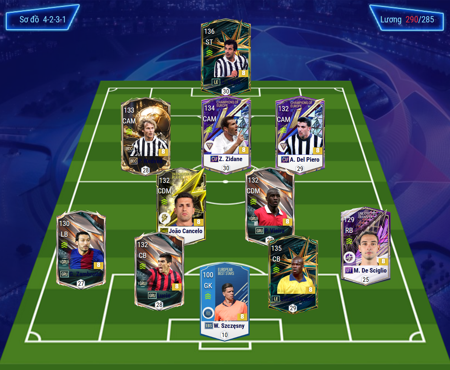 Cặp tiền vệ phòng ngự Cancelo và Vieira mang đến sự chắc chắn cần thiết. Dù khả năng sút xa chỉ ở mức tròn vai, nhưng bù lại, cả hai đều nổi bật ở khả năng tranh chấp, thu hồi bóng và hỗ trợ phòng ngự, giúp Juventus kiểm soát tốt khu vực trung tuyến. Hàng thủ gồm Zambrotta và De Sciglio ở hai biên – những hậu vệ có lối chơi toàn diện, vừa đảm bảo phòng ngự chắc chắn, vừa hỗ trợ tấn công hiệu quả thông qua các pha leo biên và tạt bóng chính xác. Ở trung tâm hàng phòng ngự, Lucio và Thuram tạo nên cặp đôi giàu sức mạnh, AI phòng ngự thông minh và khả năng cắt bóng tốt, rất phù hợp với meta hiện tại. Trong khung gỗ, Szczęsny là chốt chặn đáng tin cậy với phản xạ ổn định và khả năng làm chủ khu vực 16m50.