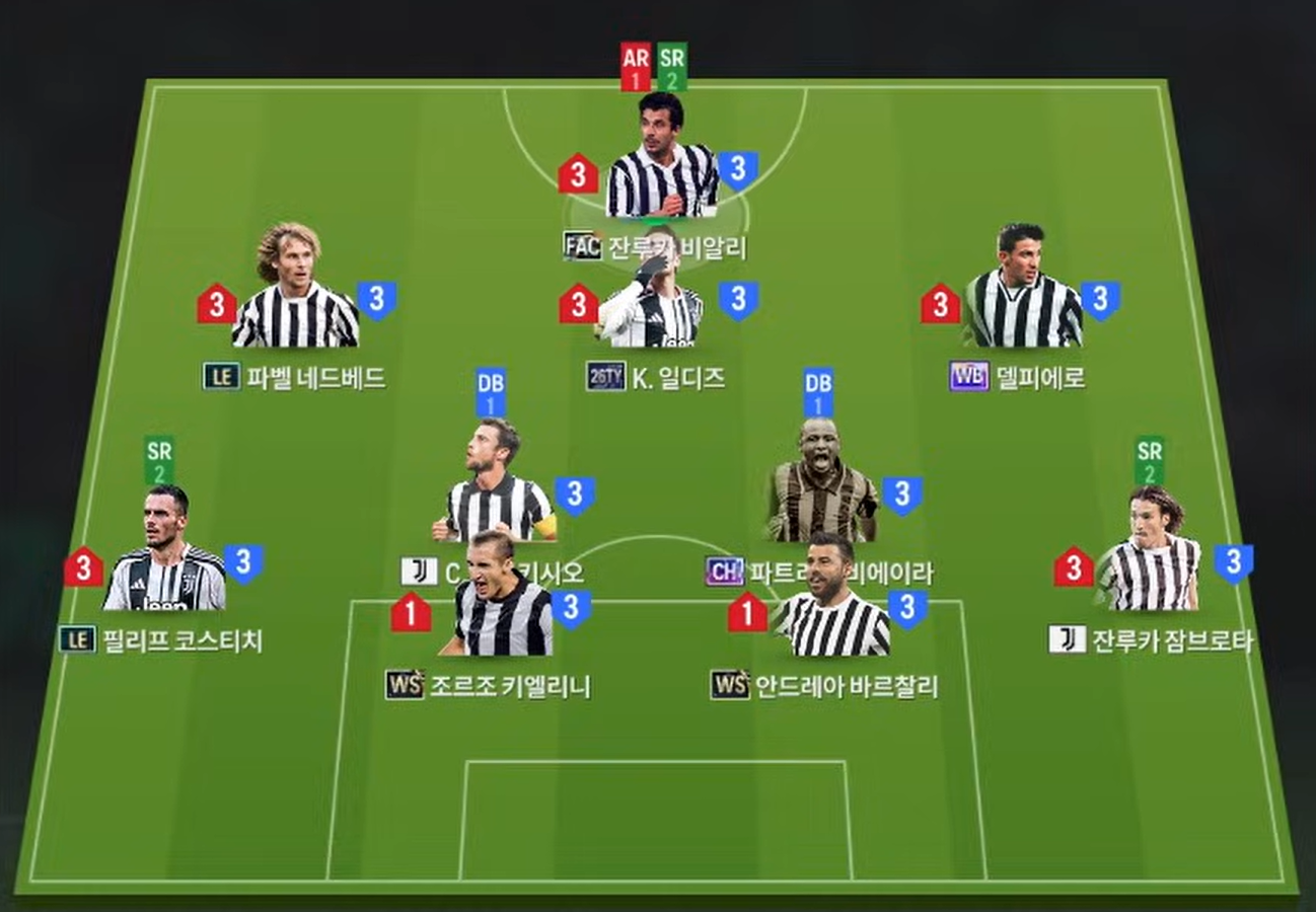Bộ ba tiền vệ công phía sau gồm Pavel Nedvěd, Kenan Yıldız và Alessandro Del Piero. Trong đó, Nedvěd và Del Piero có xu hướng hoạt động rộng ở hai biên, tận dụng khả năng rê dắt và dứt điểm, trong khi Yıldız chơi bó vào trung lộ nhiều hơn, đảm nhận vai trò hộ công và kết nối lối chơi. Ở tuyến giữa, Claudio Marchisio và Patrick Vieira mang lại sự cân bằng với khả năng tranh chấp, chuyền bóng và hỗ trợ phòng ngự hiệu quả.