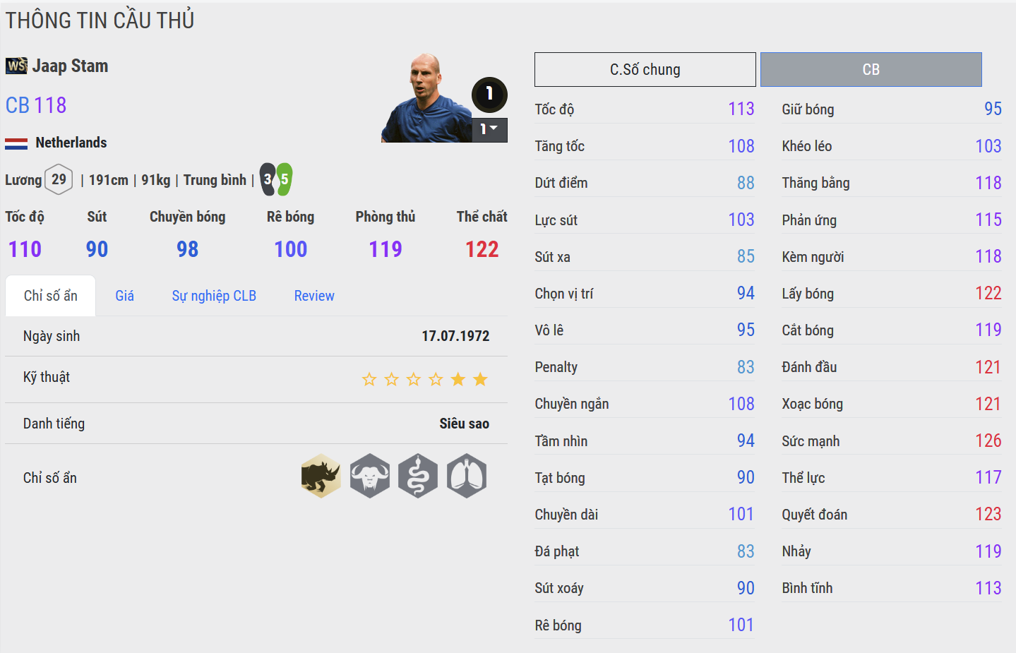 Không quá khi nói Stam WS là một trong những trung vệ có tì đè khủng nhất game. Với thân hình như một “chiếc xe tăng”, anh dễ dàng húc ngã bất kỳ tiền đạo nào dám cản đường. Cảm giác “đầm” khi điều khiển Stam rất rõ: anh giữ thăng bằng tuyệt vời, tỳ vai mạnh, và gần như không bao giờ bị đẩy ngã dù bị đối thủ áp sát. Khi kèm người, chỉ cần một cú húc vai của Stam là đối phương mất trụ ngay lập tức. Trong các tình huống 1v1, anh tạo ra cảm giác áp lực cực lớn – khiến tiền đạo phải chuyền đi hoặc mất bóng trước khi kịp xoay sở.
