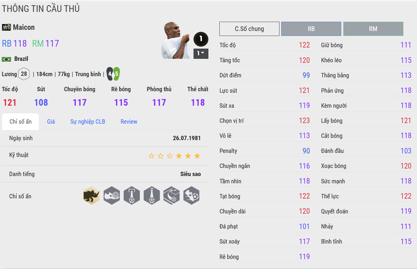 Maicon WS Đây chính là lý do khiến Maicon WS trở thành RB hàng đầu: tì đè cực khỏe, thân người chắc và va chạm rất “lực”. Trong các pha đấu tay đôi, anh luôn tạo được sự áp đảo, đặc biệt khi ép biên hoặc húc ngã những winger nhẹ cân. Khả năng giữ thăng bằng tốt giúp anh cướp bóng hiệu quả trong khi vẫn duy trì được tốc độ.