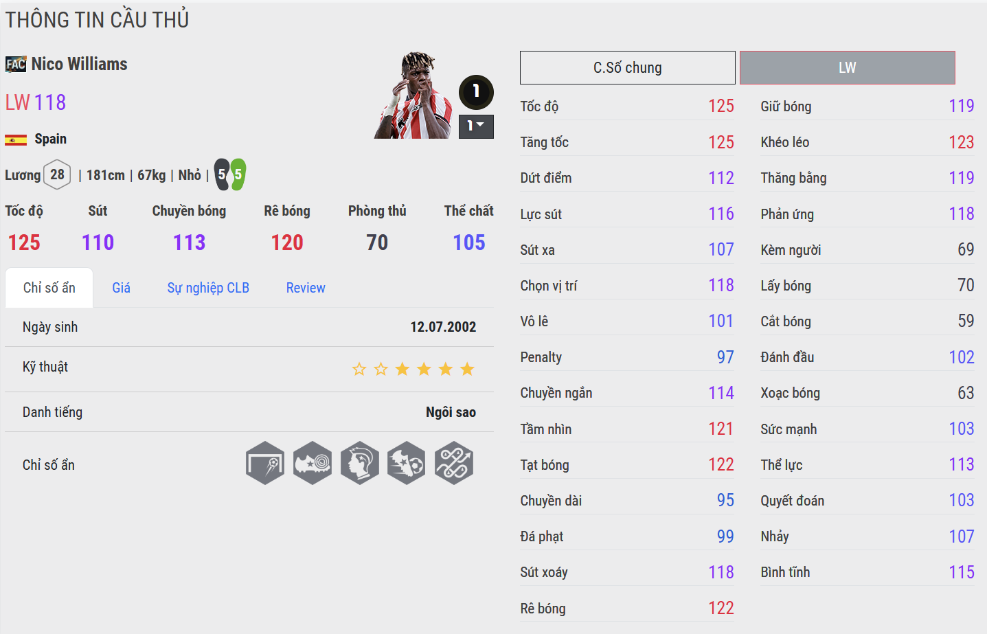 Tì đè không phải thế mạnh của Nico Williams FAC. Thể hình mỏng khiến anh dễ thua thiệt khi va chạm trực diện. Lối chơi của Nico thiên về tốc độ và kỹ thuật, nên hiệu quả nhất khi người chơi hạn chế các pha tranh chấp mạnh, ưu tiên không gian và xử lý sớm.