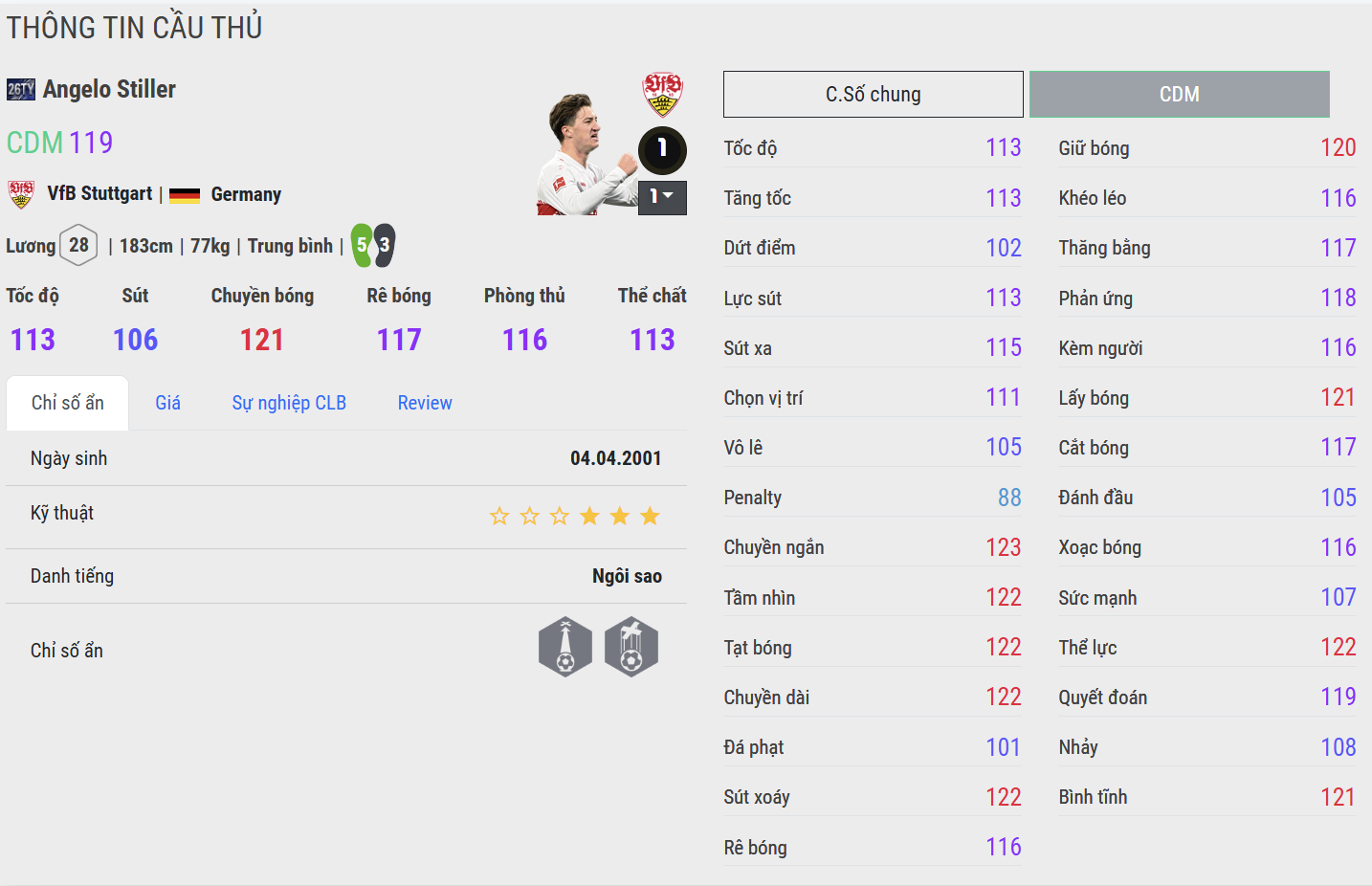 Angelo Stiller là tiền vệ trung tâm người Đức nổi bật với lối chơi thông minh và khả năng điều tiết nhịp độ trận đấu. Thi đấu ở vai trò mỏ neo hoặc tiền vệ trung tâm lệch trái, Stiller gây ấn tượng nhờ nhãn quan chiến thuật tốt và sự điềm tĩnh khi cầm bóng.