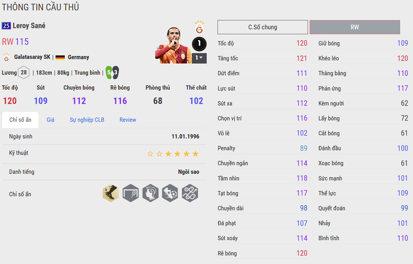 Leroy Sane là mẫu cầu thủ chạy cánh hiện đại nổi bật với tốc độ bùng nổ và khả năng tạo đột biến cao. Trong màu áo FC Bayern Munich, anh thường xuyên là mũi khoan phá nguy hiểm ở hành lang cánh, mang đến sự khác biệt trong những tình huống tấn công biên.