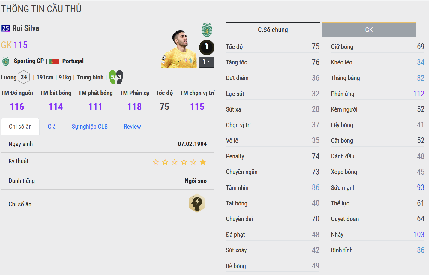 Phản xạ của Rui Silva ở mức khá tốt. Anh có thể cản phá những cú sút trong vòng cấm với tốc độ ra tay ổn định. Dù không quá “ảo” như các top GK, nhưng vẫn đủ để tạo sự yên tâm trong những tình huống cơ bản.