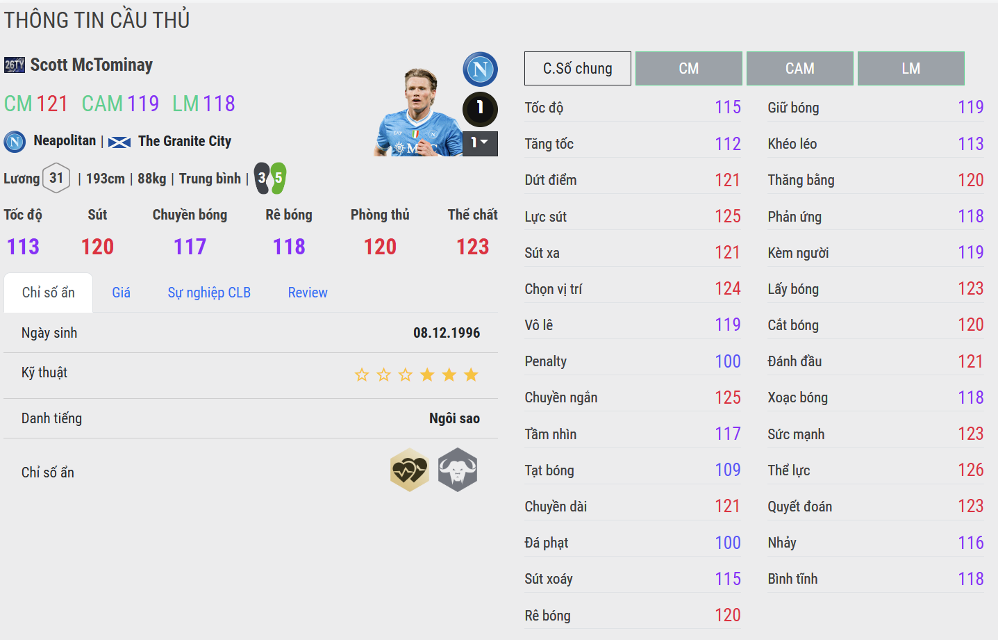 Scott McTominay là mẫu tiền vệ trung tâm mang đậm chất thể lực và tinh thần chiến binh – nơi sức mạnh, kỷ luật và sự đơn giản tạo nên giá trị thực tiễn. Anh nổi bật với thể hình lý tưởng, khả năng tranh chấp tay đôi quyết liệt và sự xông xáo trong các pha thu hồi bóng, mang lại cảm giác chắc chắn cho tuyến giữa.