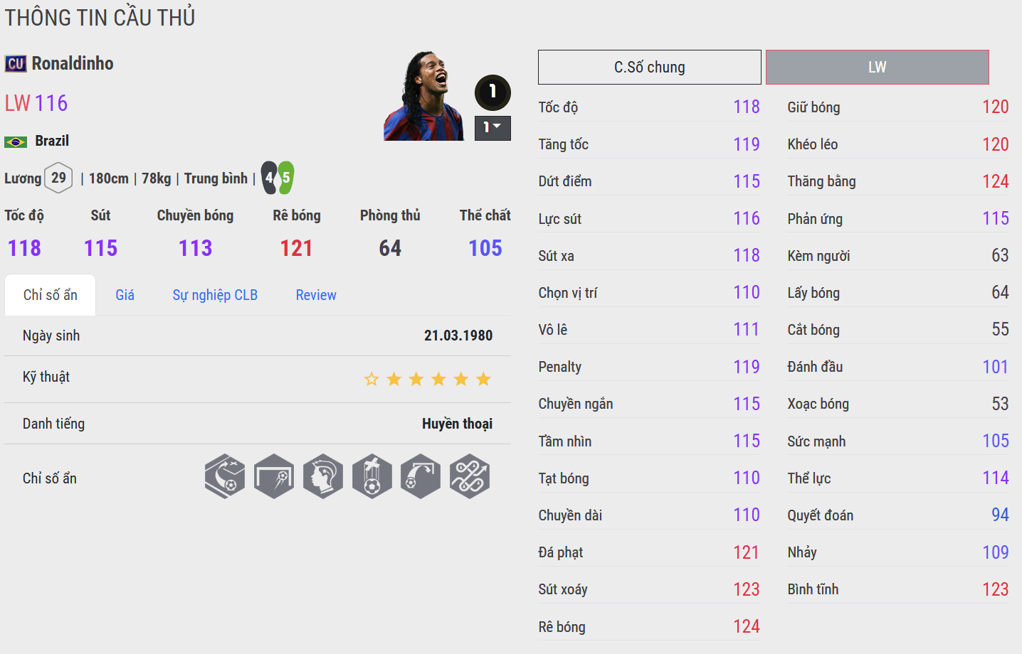 Ronaldinho CU mang đến phong cách chơi bóng đầy ngẫu hứng với kỹ thuật cá nhân cực kỳ điêu luyện. Những pha rê bóng mềm mại, xử lý tinh tế và khả năng tạo đột biến giúp anh trở thành mũi tấn công rất khó đoán. Trong thực chiến, Ronaldinho đặc biệt phù hợp với lối đá thiên về kỹ thuật và kiểm soát bóng.