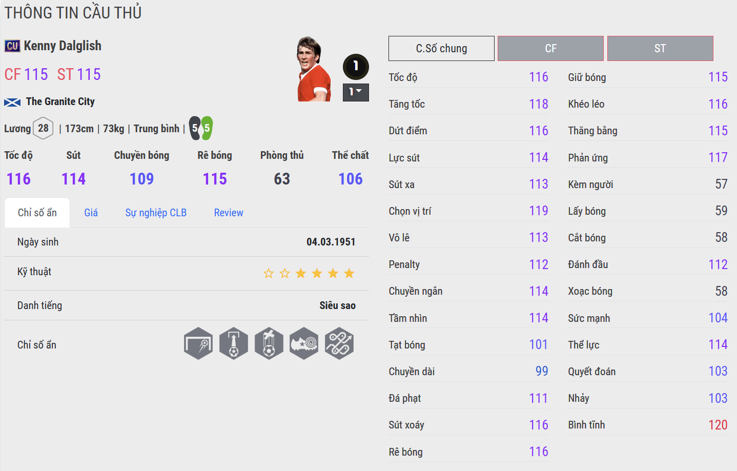 Kenny Dalglish CU nổi bật với sự linh hoạt trong lối chơi tấn công. Dalglish có thể vừa rê bóng, vừa phối hợp và dứt điểm khá toàn diện. Khả năng xử lý bóng gọn gàng trong phạm vi hẹp cùng những pha dứt điểm chính xác giúp anh trở thành lựa chọn rất hiệu quả ở tuyến trên.