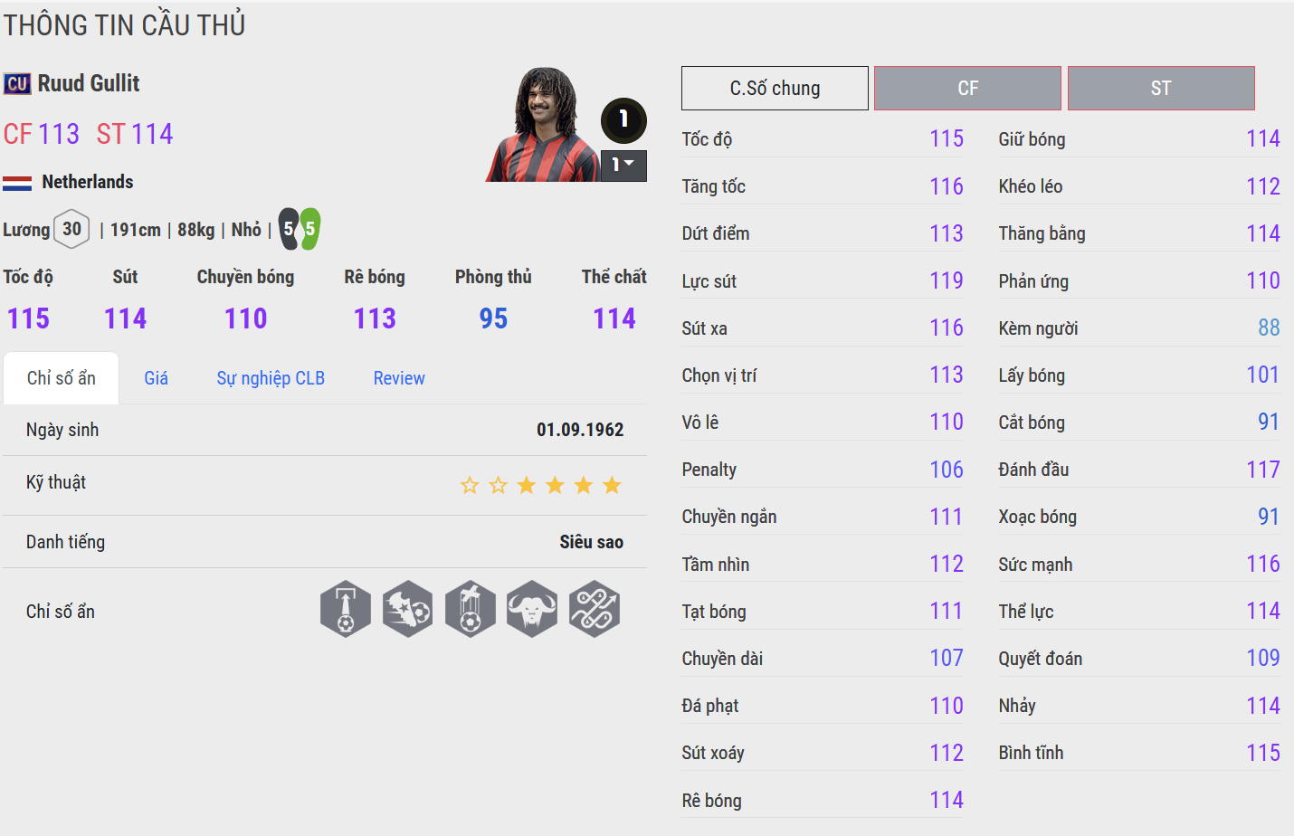 Ruud Gullit CU mang đến hình ảnh của một cầu thủ toàn diện với thể chất vượt trội và khả năng chơi bóng đa năng. Gullit có thể tham gia vào mọi khía cạnh của trận đấu, từ tranh chấp, giữ bóng cho đến dứt điểm. Trong thực chiến, anh mang lại sự cân bằng cực kỳ tốt cho đội hình.