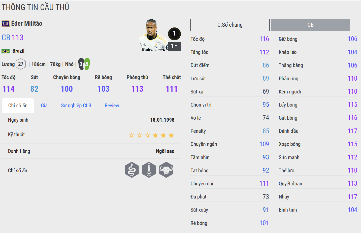 Eder Militao CU là mẫu trung vệ thiên về tốc độ và khả năng bọc lót. Anh có thể theo kèm tốt những tiền đạo nhanh, xử lý linh hoạt trong các tình huống 1vs1. Tuy nhiên, đôi lúc sự ổn định trong tranh chấp tay đôi vẫn chưa thực sự vượt trội so với các cái tên phía trên.