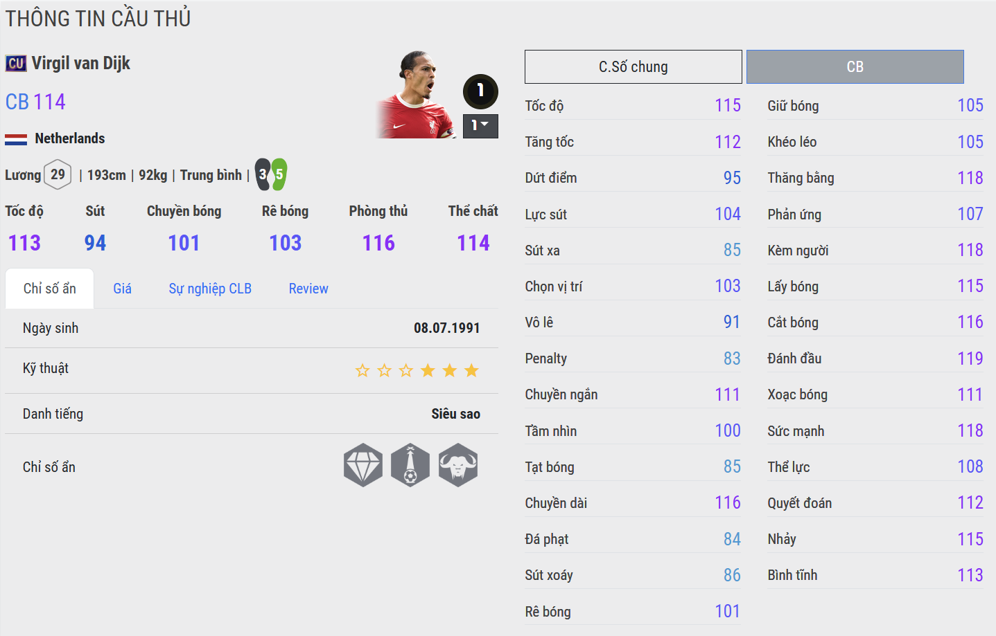 Virgil van Dijk CU mang đến sự chắc chắn nhờ thể hình và khả năng tranh chấp vượt trội. Van Dijk rất mạnh trong các tình huống không chiến và tì đè, đồng thời giữ vị trí tốt. Dù vậy, tốc độ xoay sở trong một số tình huống bị phản công nhanh vẫn là điểm cần cân nhắc.