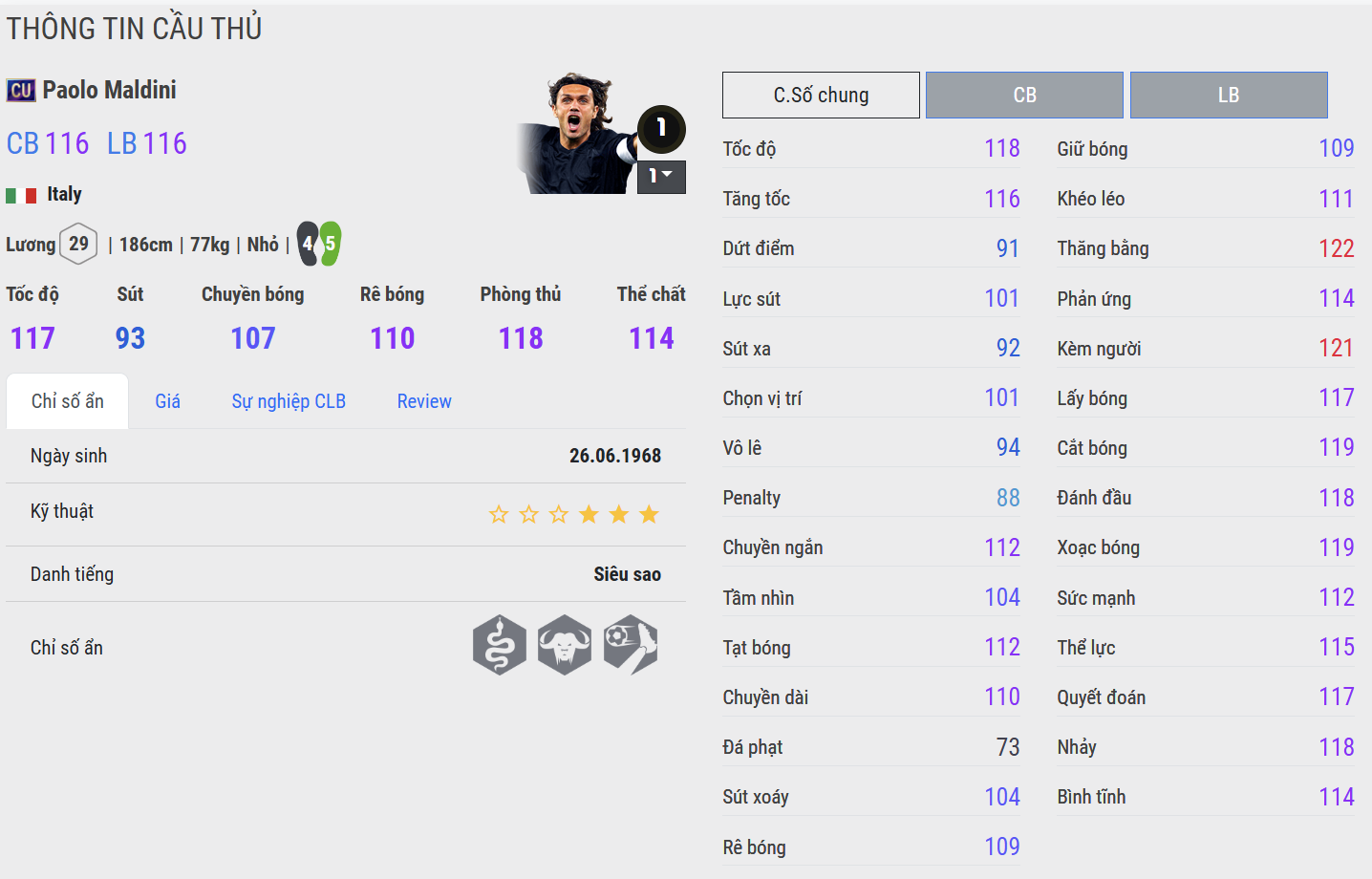 Paolo Maldini CU nổi bật với khả năng đọc tình huống và phòng ngự thông minh. Maldini không cần tranh chấp quá nhiều nhưng vẫn kiểm soát tốt khu vực của mình nhờ chọn vị trí chuẩn xác. Trong thực chiến, anh mang lại cảm giác phòng ngự rất “sạch” và ổn định.