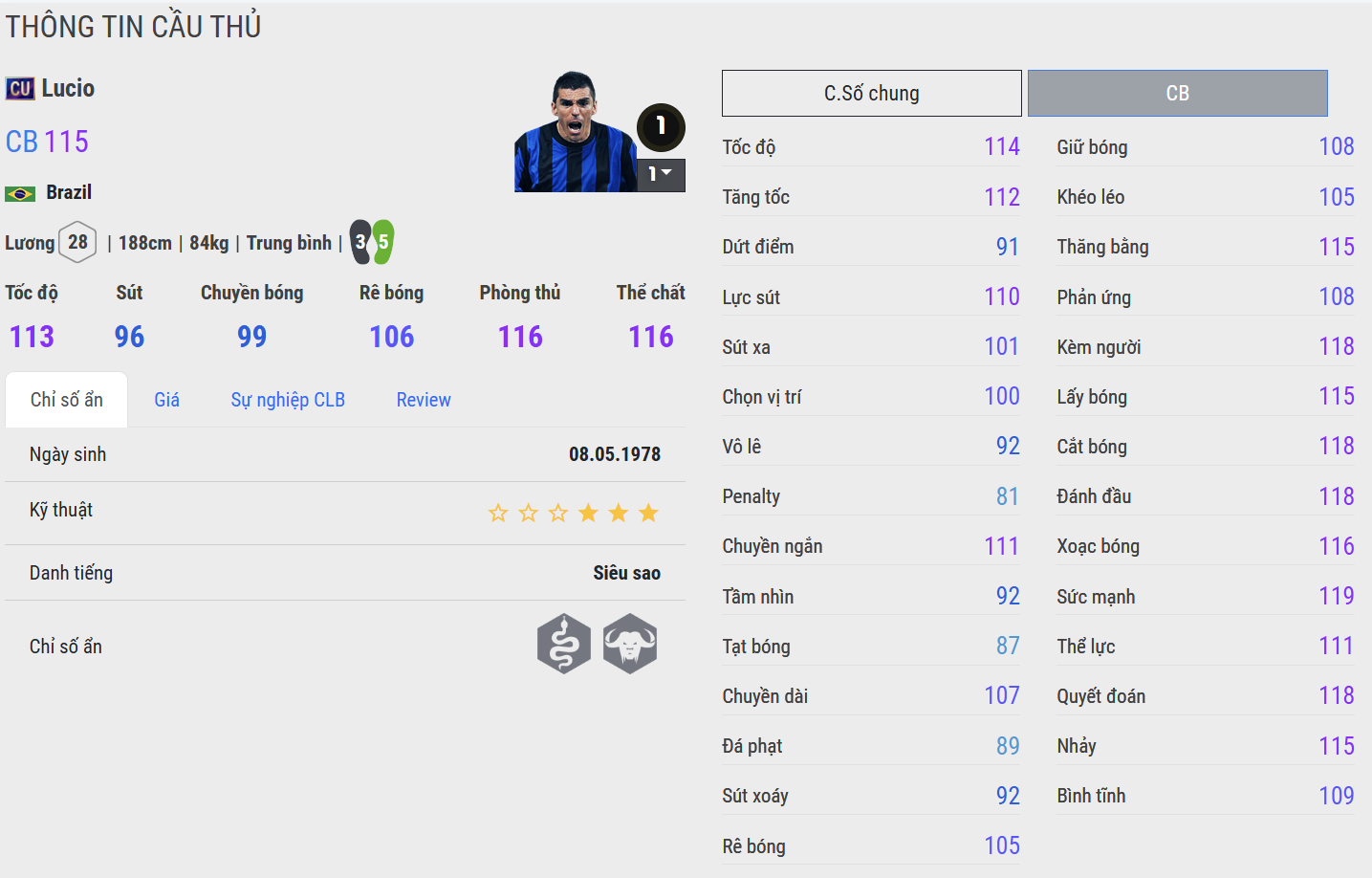 Lucio CU là trung vệ toàn diện nhất trong danh sách này. Anh sở hữu thể chất vượt trội, khả năng tranh chấp mạnh mẽ cùng tốc độ đủ tốt để xử lý nhiều tình huống khác nhau. Điểm nổi bật của Lucio là sự ổn định cực cao trong thực chiến, gần như không có điểm yếu rõ rệt, giúp anh trở thành lựa chọn hàng đầu nơi hàng phòng ngự.