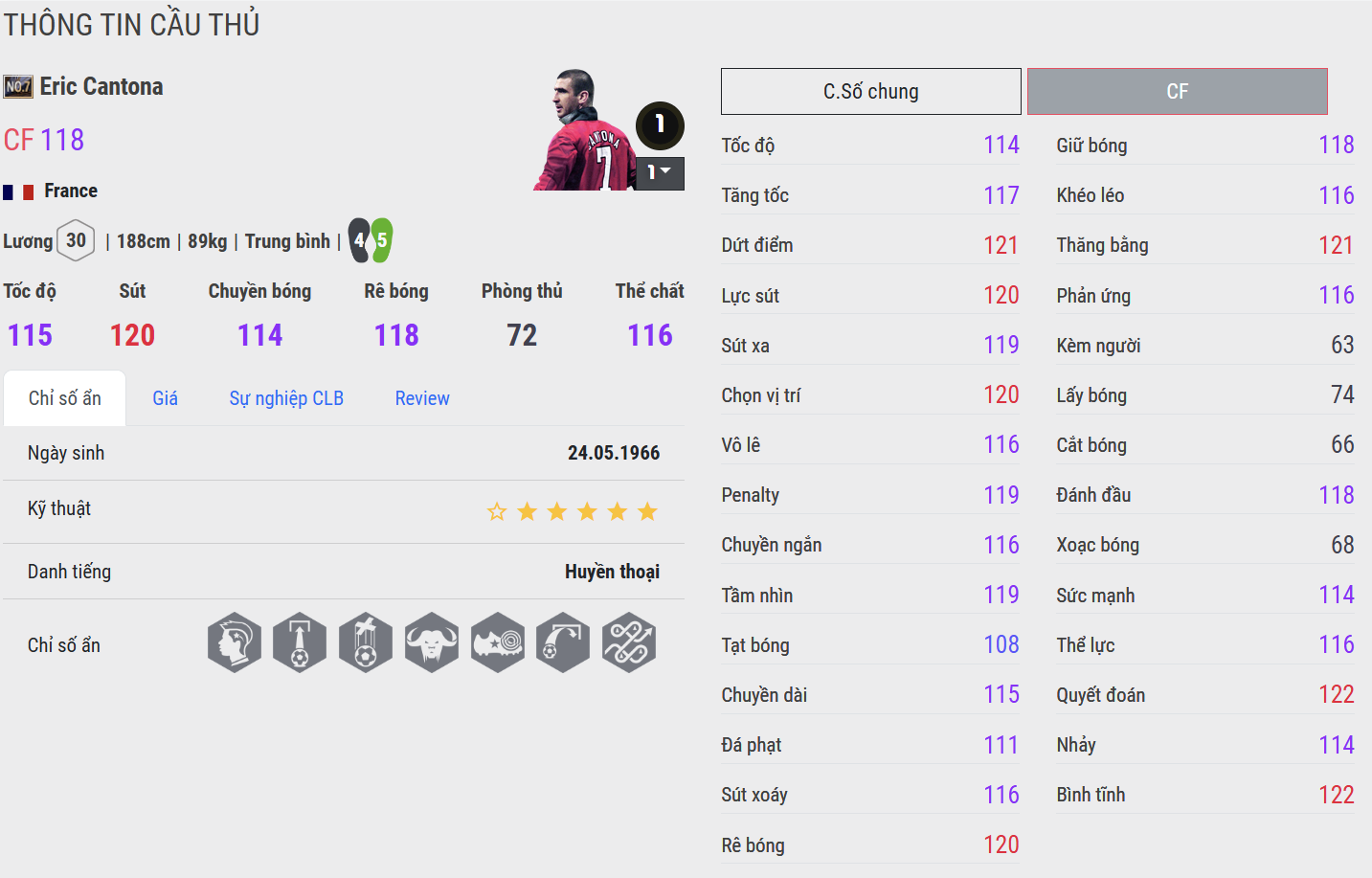 Lối chơi thủ lĩnh, dứt điểm uy lực. Cantona mang hình ảnh một số 7 cổ điển: mạnh mẽ, kiêu hãnh và đầy chất ngạo nghễ. Trong game, anh là mẫu tiền đạo hoặc hộ công lý tưởng nhờ thể hình tốt, khả năng dứt điểm từ xa cực kỳ ấn tượng cùng các pha giữ bóng làm tường hiệu quả. Không cần quá hoa mỹ, Cantona vẫn luôn biết cách tạo ra khác biệt bằng sự hiệu quả lạnh lùng trong từng pha xử lý.