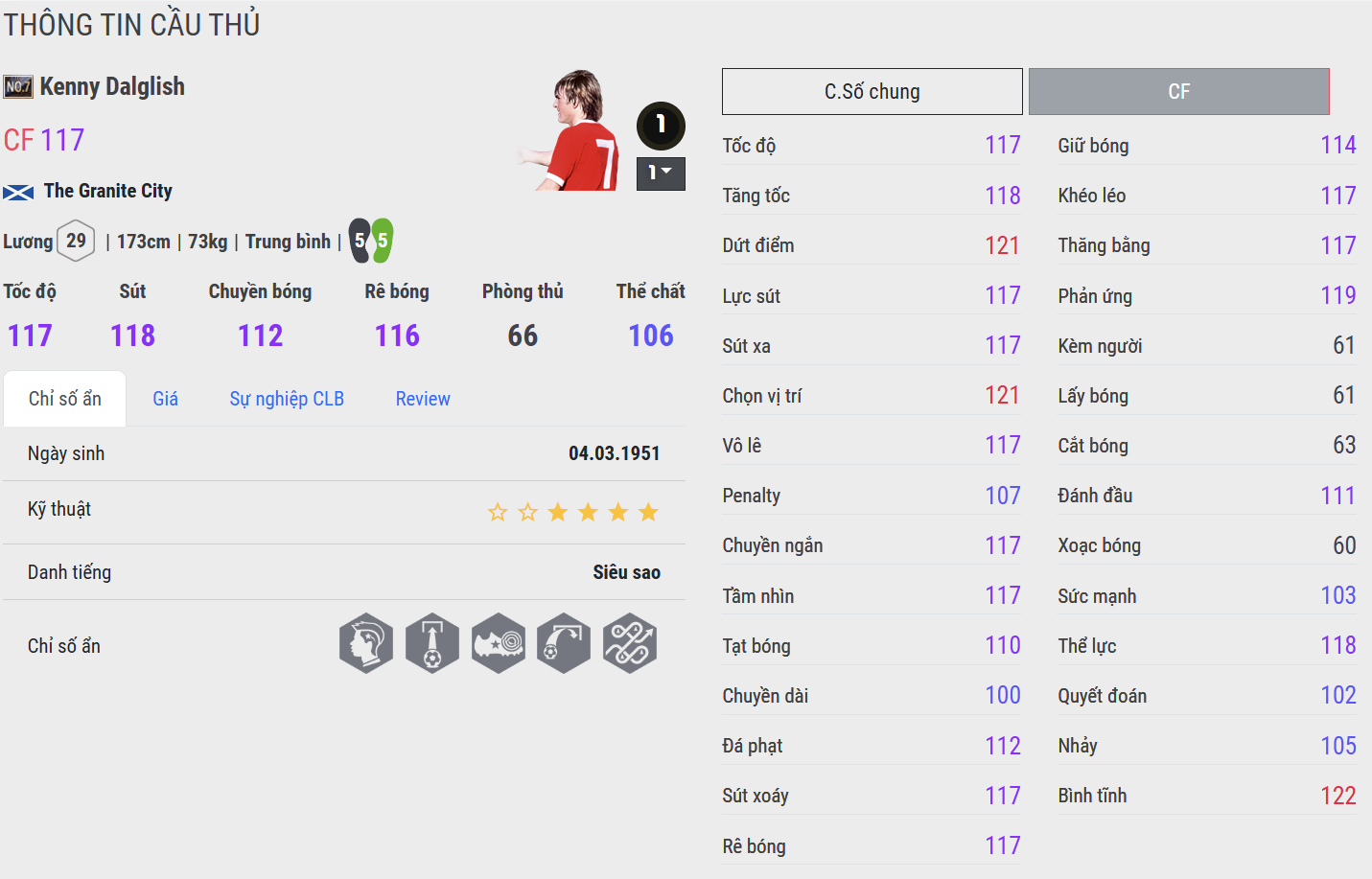 Sát thủ vòng cấm, xử lý mượt mà. Dalglish là mẫu tiền đạo cổ điển nhưng cực kỳ phù hợp với gameplay hiện tại nhờ khả năng di chuyển khôn ngoan và xử lý bóng đầy tinh tế. Những cú dứt điểm một chạm, sút má ngoài hoặc lốp bóng của ông đều mang lại cảm giác “nghệ sĩ”. Dù không quá mạnh ở thể hình, nhưng sự tinh ranh trong di chuyển và chọn vị trí khiến Dalglish luôn là mối đe dọa thường trực trước khung thành.