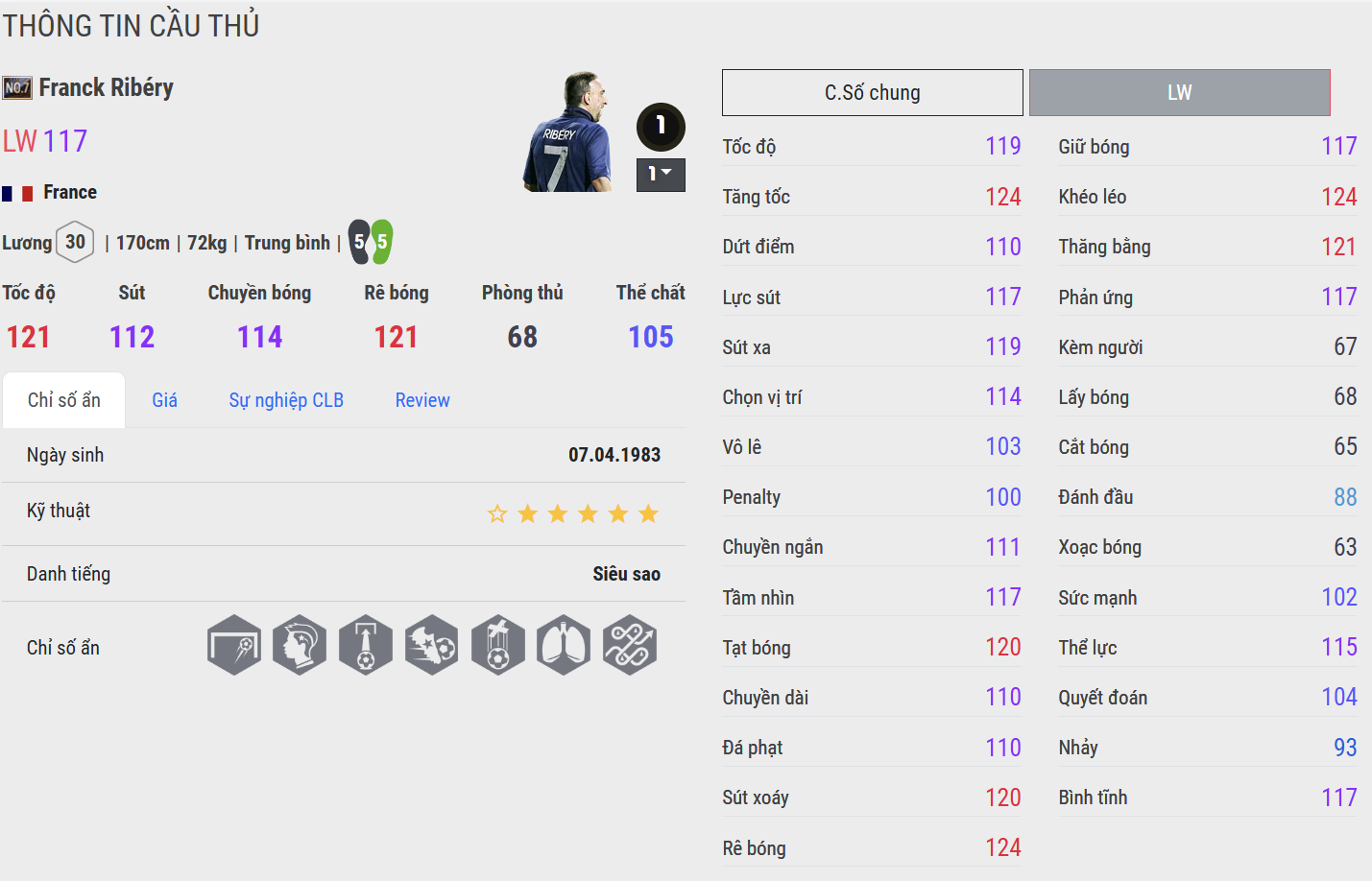 Khéo léo, khó lường và giàu đột biến. Ribéry là định nghĩa hoàn hảo cho một số 7 hiện đại: kỹ thuật cao, tốc độ tốt và khả năng tạo đột biến mỗi khi có bóng. Với kỹ năng 5 sao, chân thuận cả hai, cùng khả năng rê dắt khó chịu, Ribéry rất nguy hiểm khi đối mặt 1v1 hoặc bó vào trong dứt điểm. Anh là lựa chọn hàng đầu cho lối đá pressing biên hoặc phản công tốc độ.