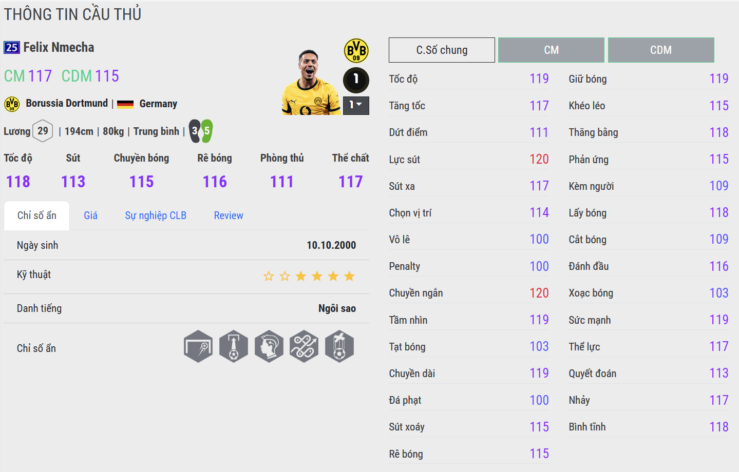 Felix Nmecha 25UCL là mẫu CM thể chất, hỗ trợ tranh chấp và di chuyển rộng. Khả năng thu hồi bóng ở mức khá, chuyền ngắn an toàn và giữ vị trí ổn định. Tuy nhiên khả năng tạo đột biến hoặc sút xa chưa thật sự nổi bật, phù hợp vai trò xoay tua hoặc đá cặp cùng một CDM mạnh hơn.