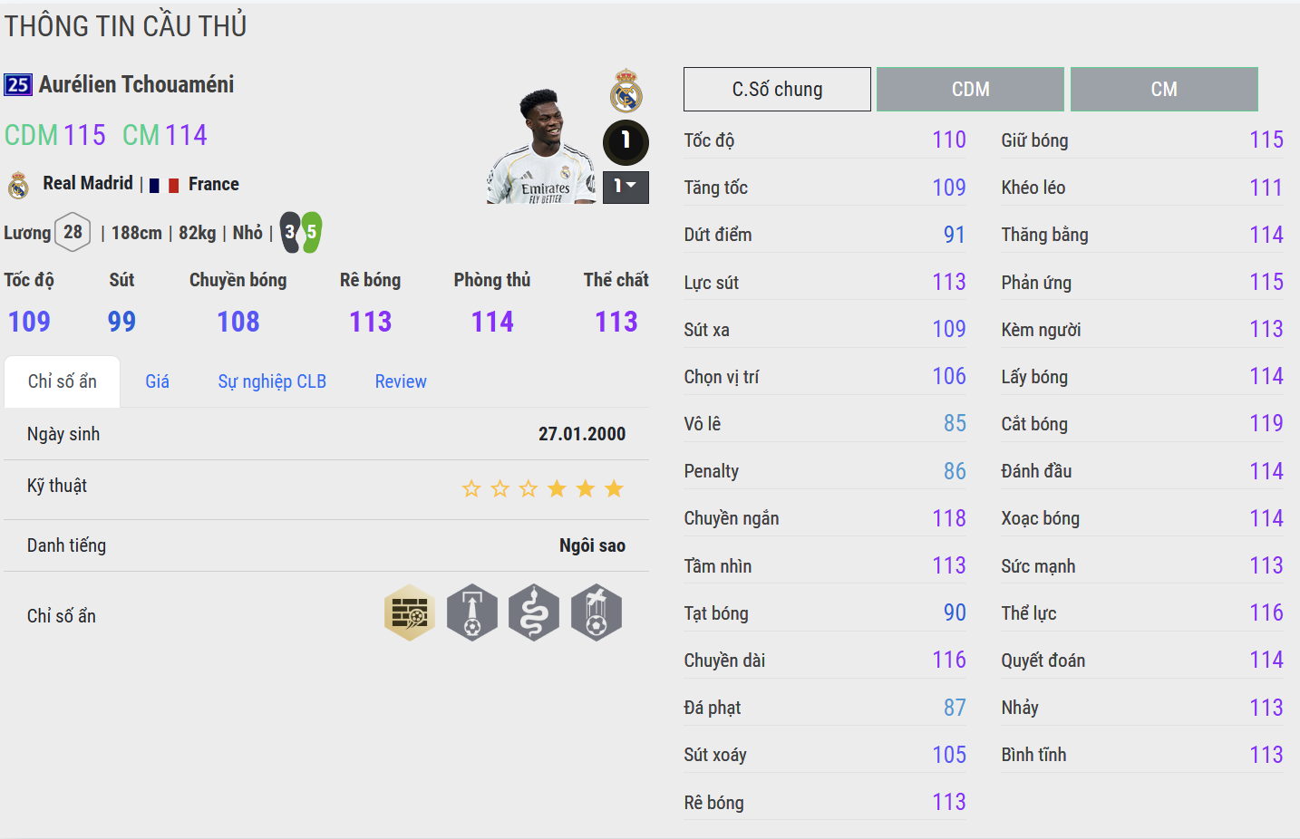Aurelien Tchouameni 25UCL thiên về phòng ngự rõ rệt. Sải chân dài, tắc bóng chính xác và che chắn không gian tốt trước hàng thủ. Điểm mạnh nằm ở khả năng cắt đường chuyền và giữ cấu trúc đội hình. Tuy nhiên khi cầm bóng dâng cao hoặc tham gia tấn công, hiệu quả chưa thật sự linh hoạt.