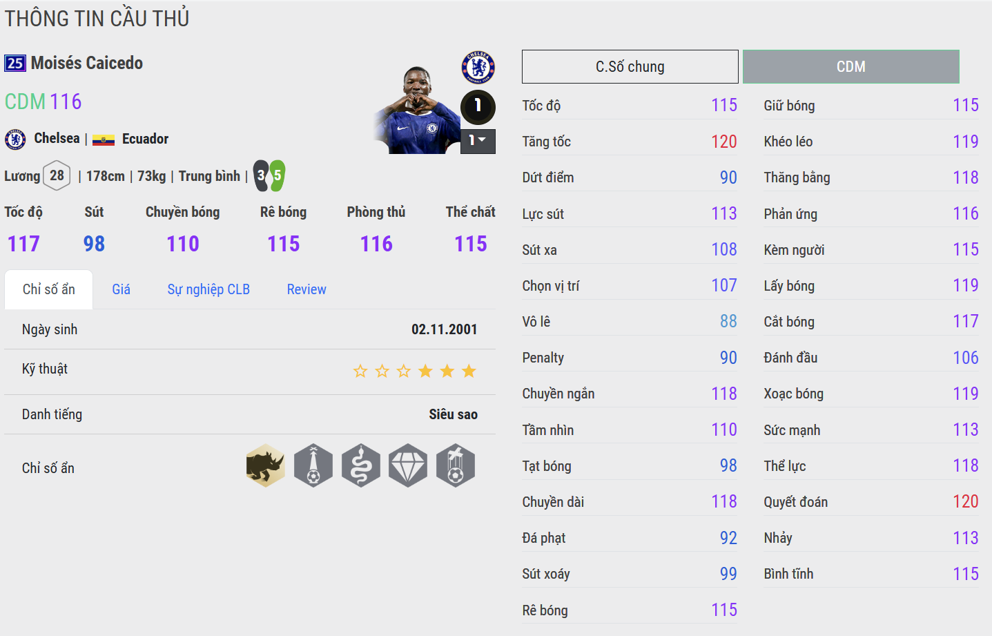 Moises Caicedo 25UCL mang phong cách box-to-box thiên phòng ngự. Khả năng áp sát nhanh và tranh chấp tay đôi rất hiệu quả trong meta pressing. Ngoài ra, Caicedo có thể chuyền chuyển trạng thái khá tốt sau khi cướp bóng. Hạn chế nhỏ là những pha xử lý trong không gian hẹp chưa quá mượt.