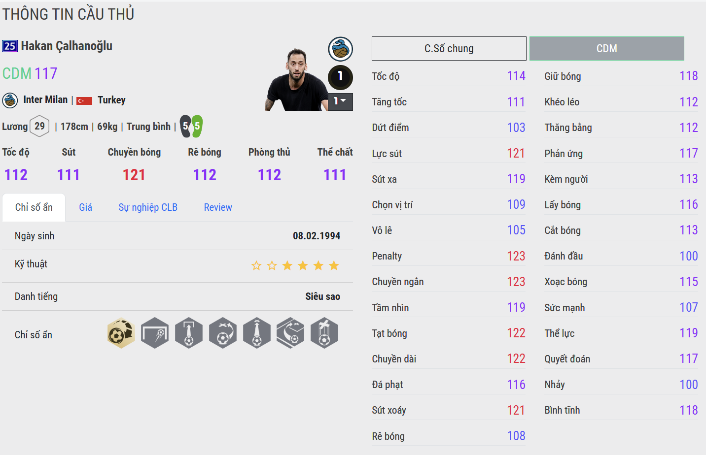 Hakan Calhanoglu 25UCL là mẫu CM thiên kỹ thuật và sáng tạo. Khả năng sút xa và đá phạt rất nguy hiểm, đặc biệt trong các tình huống ngoài vòng cấm. Chuyền dài và điều tiết nhịp độ tốt hơn nhóm thuần CDM phía dưới. Tuy nhiên khi phải tranh chấp cường độ cao liên tục, thể chất không phải điểm mạnh nhất.