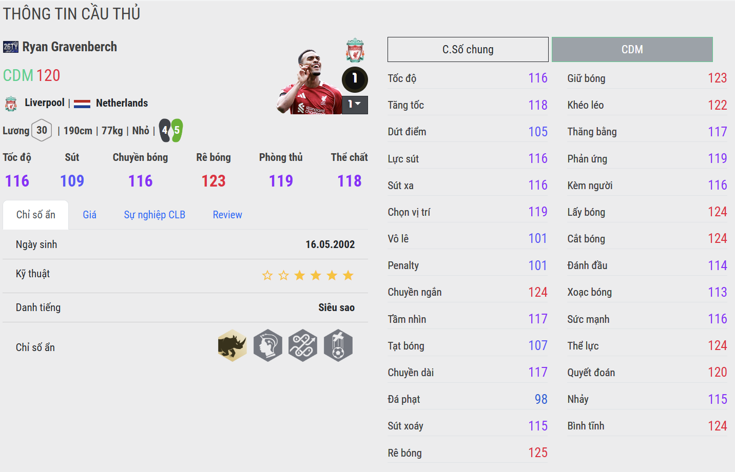 Gravenberch 26TOTY mang đến hình ảnh một tiền vệ trung tâm trẻ trung, giàu năng lượng và sở hữu nền tảng thể chất nổi bật. Với sải chân dài, khả năng cầm bóng tự tin và những pha bứt lên tuyến trên đầy mạnh mẽ, anh tạo ra sức ép liên tục từ trung lộ. Phiên bản này phù hợp với lối chơi cần sự đột phá và khả năng xuyên phá từ hàng tiền vệ.