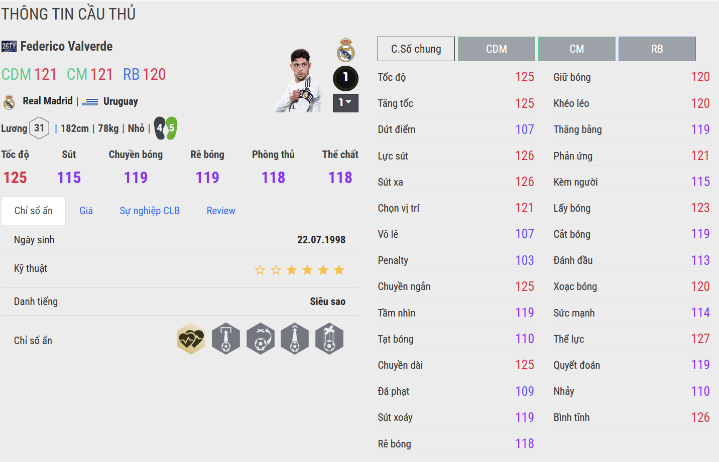 Valverde 26TOTY là hiện thân của nhịp độ và cường độ thi đấu cao. Khả năng hoạt động rộng, tranh chấp quyết liệt và những pha xâm nhập vòng cấm đúng thời điểm giúp anh trở thành mắt xích cực kỳ quan trọng trong cả tấn công lẫn phòng ngự. Đây là mẫu tiền vệ “box-to-box” đúng nghĩa, mang lại sự cân bằng và tính chiến đấu cho tuyến giữa.