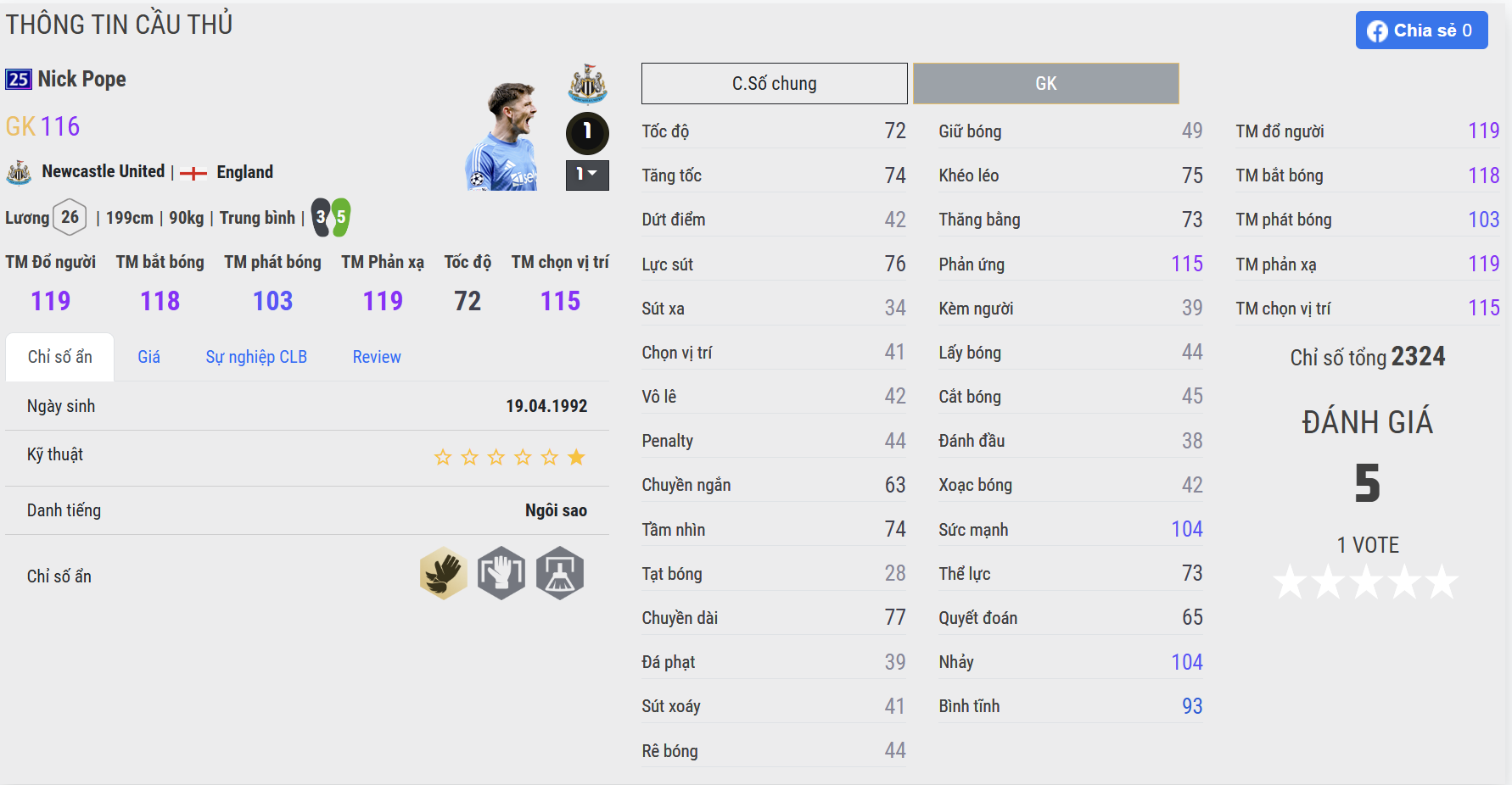 Nick Pope 25UCL sở hữu thể hình tốt cùng sải tay dài, giúp anh chiếm ưu thế trong các tình huống bóng bổng. Khả năng cản phá những cú sút xa và phản xạ trong vòng cấm của Pope khá đáng tin cậy. Tuy nhiên, tốc độ phản ứng ở một số tình huống gần vẫn chưa thật sự vượt trội so với các thủ môn top trên.
