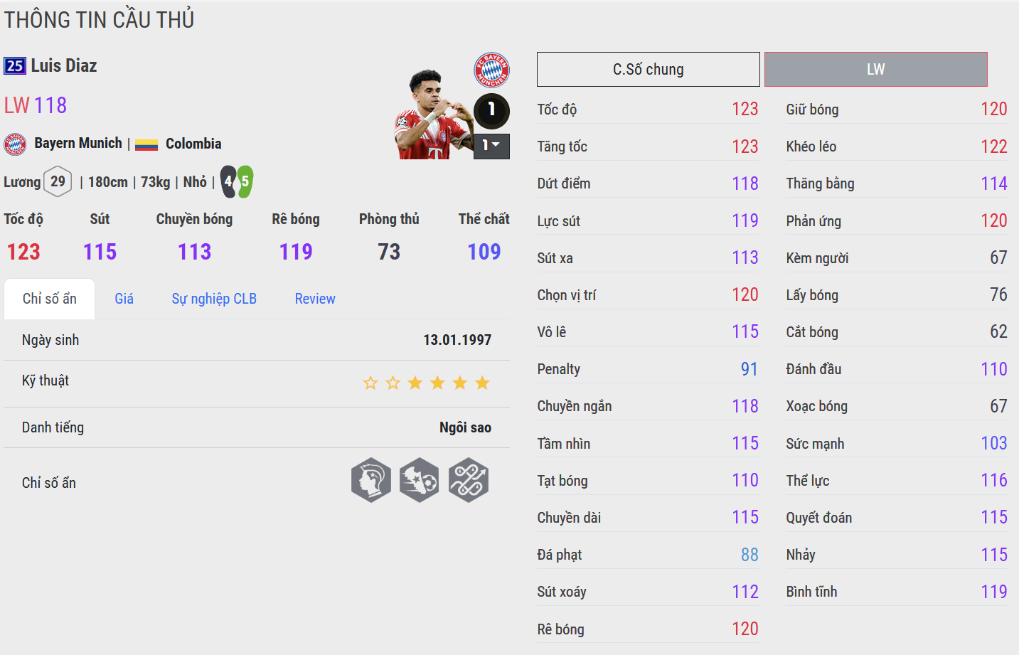 Luis Díaz 25UCL là mẫu cầu thủ chạy cánh thiên về tốc độ và khả năng đột phá trực diện. Những pha tăng tốc dọc biên của anh mang lại cảm giác rất khó chịu cho hàng phòng ngự, đặc biệt trong các tình huống một đối một. Điểm mạnh của Diaz nằm ở khả năng rê bóng linh hoạt và sự nhanh nhẹn trong không gian hẹp, dù ở khâu dứt điểm đôi khi vẫn thiếu một chút độ ổn định trong những pha xử lý cuối cùng.