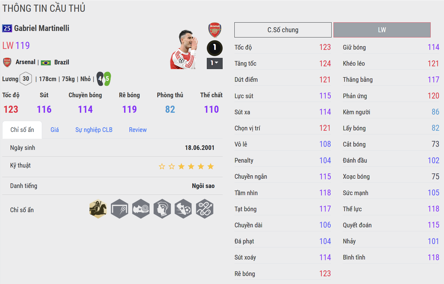 Gabriel Martinelli 25UCL là mẫu cầu thủ chạy cánh hiện đại với tốc độ cao và khả năng di chuyển cực kỳ năng nổ. Anh thường xuyên thực hiện những pha bứt tốc phía sau hàng thủ hoặc cắt vào trung lộ để tìm kiếm cơ hội dứt điểm. Trong thực chiến, Martinelli mang lại cảm giác rất trực diện và hiệu quả, đặc biệt phù hợp với những đội hình chơi pressing và chuyển trạng thái nhanh.