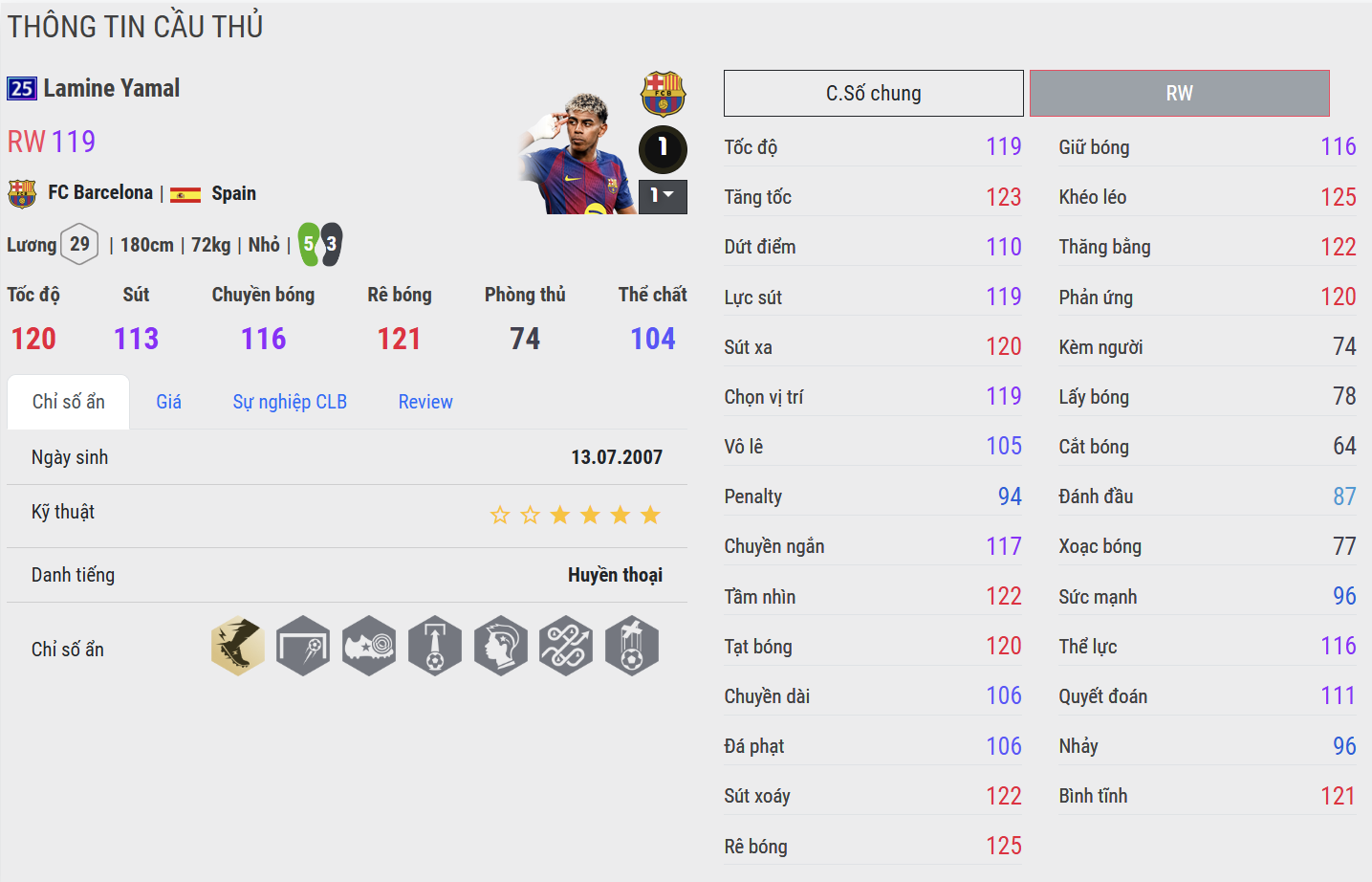 Lamine Yamal 25UCL gây ấn tượng mạnh nhờ kỹ thuật cá nhân cực kỳ khéo léo cùng khả năng rê bóng rất dính chân. Những pha xử lý của Yamal mang lại cảm giác mềm mại và khó đoán, giúp anh dễ dàng vượt qua hậu vệ trong các tình huống một đối một. Tốc độ tốt cùng khả năng tạo đột biến cao khiến Yamal trở thành một trong những cầu thủ chạy cánh nguy hiểm nhất trong mùa thẻ này.