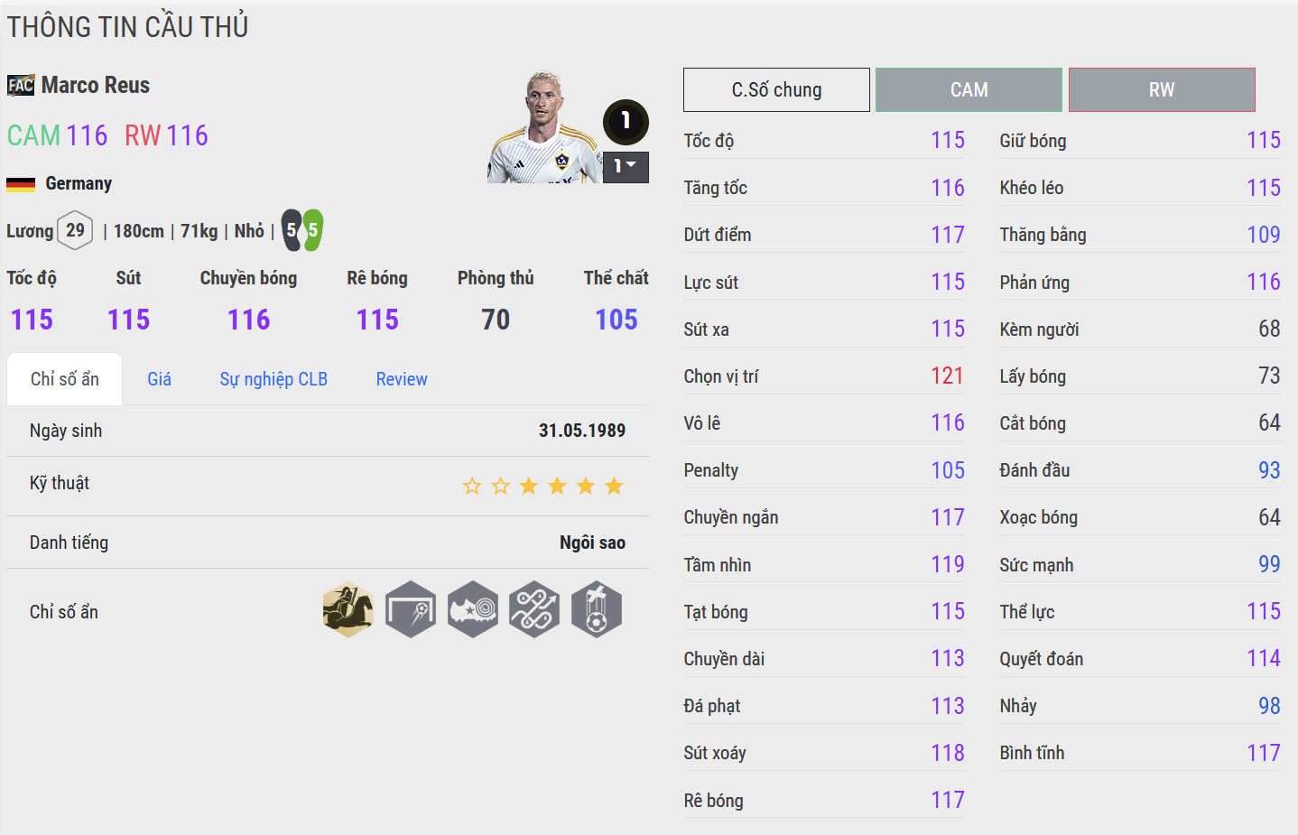 Reus FAC mang lối chơi thông minh và mềm mại. Anh di chuyển khôn ngoan, xử lý bóng gọn gàng và chuyền mở biên rất tinh tế. Không quá hoa mỹ nhưng cực kỳ hiệu quả, Reus phù hợp với lối chơi phối hợp nhỏ và cần sự ổn định ở hành lang phải.