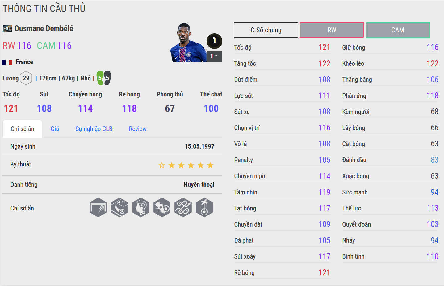 Dembélé FAC nổi bật với tốc độ bùng nổ và kỹ thuật đảo hướng khó lường. Hai chân thi đấu như một giúp anh vừa tạt tốt, vừa dứt điểm nguy hiểm. Đây là mẫu RM mang tính đột phá cao, có thể xuyên phá hàng thủ chỉ bằng một pha xử lý.