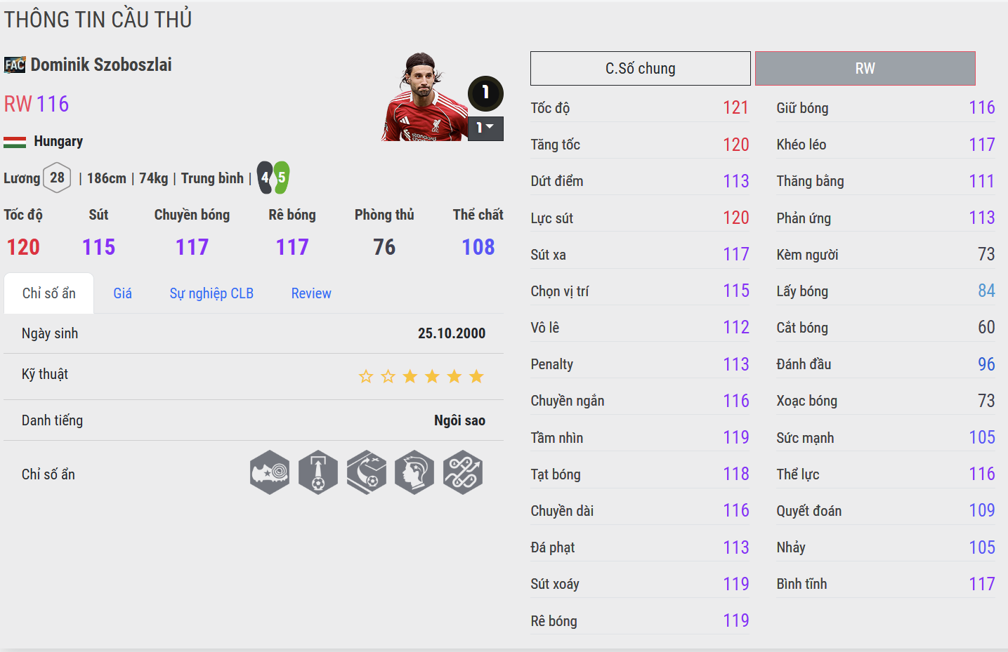 Szoboszlai FAC mạnh mẽ, bao quát biên tốt và sở hữu khả năng sút xa chất lượng. Anh chuyền – tạt – dứt điểm đều ổn định, tạo cảm giác “đa năng – trực diện – hiệu quả”. Rất hợp cho lối chơi pressing và biên công cường độ cao.