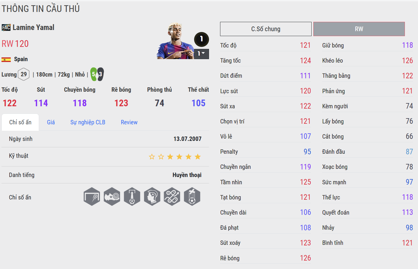 Yamal FAC mềm mại, tinh tế và tốc độ đoạn ngắn cực tốt. Anh rê bóng tự nhiên, cắt vào trong sắc bén và tạo ra nhiều pha bóng giàu tính đột biến. Lựa chọn lý tưởng cho người thích RM thiên về kỹ thuật thanh thoát.