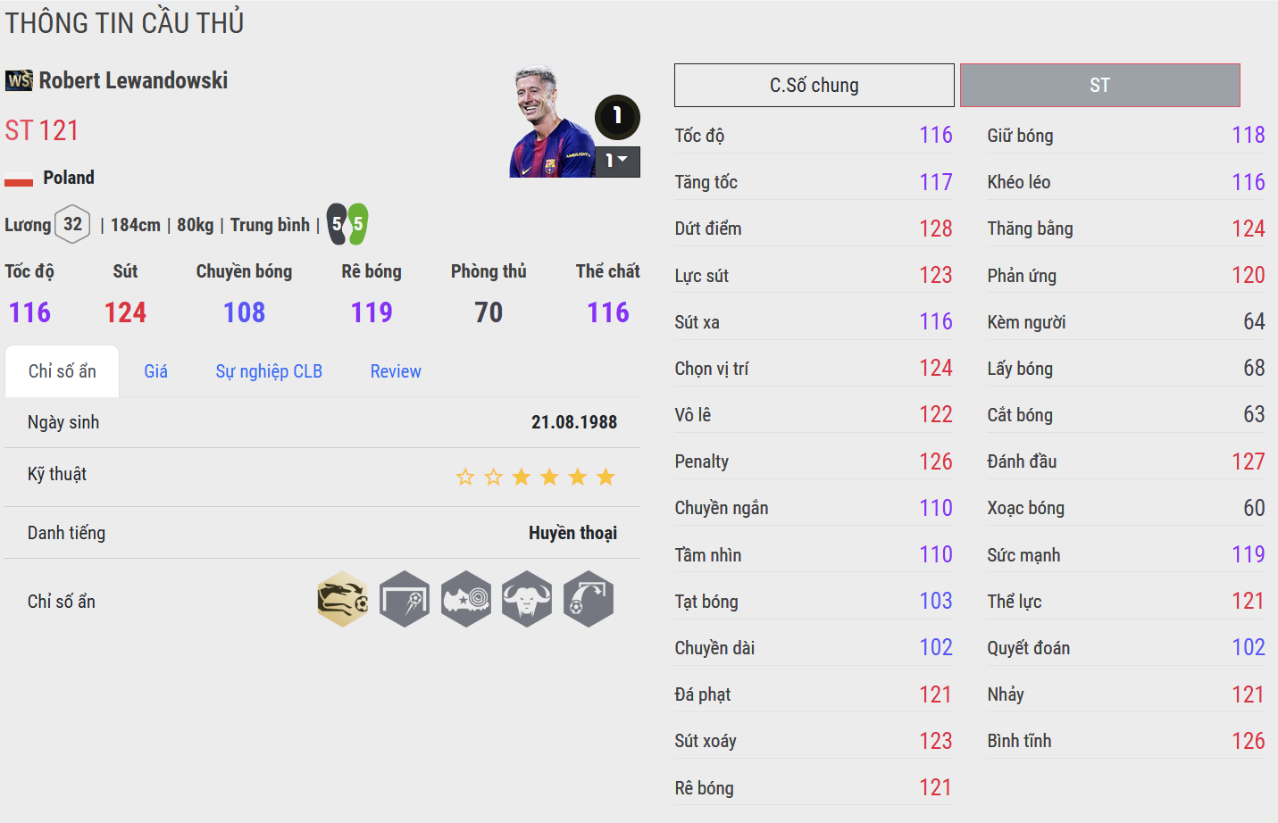 Trung phong người Ba Lan tái hiện hình ảnh “cỗ máy ghi bàn” đích thực. Với khả năng chọn vị trí chuẩn xác và dứt điểm đa dạng, Lewandowski WS là lựa chọn lý tưởng cho lối chơi thiên về sức mạnh và sự ổn định.
