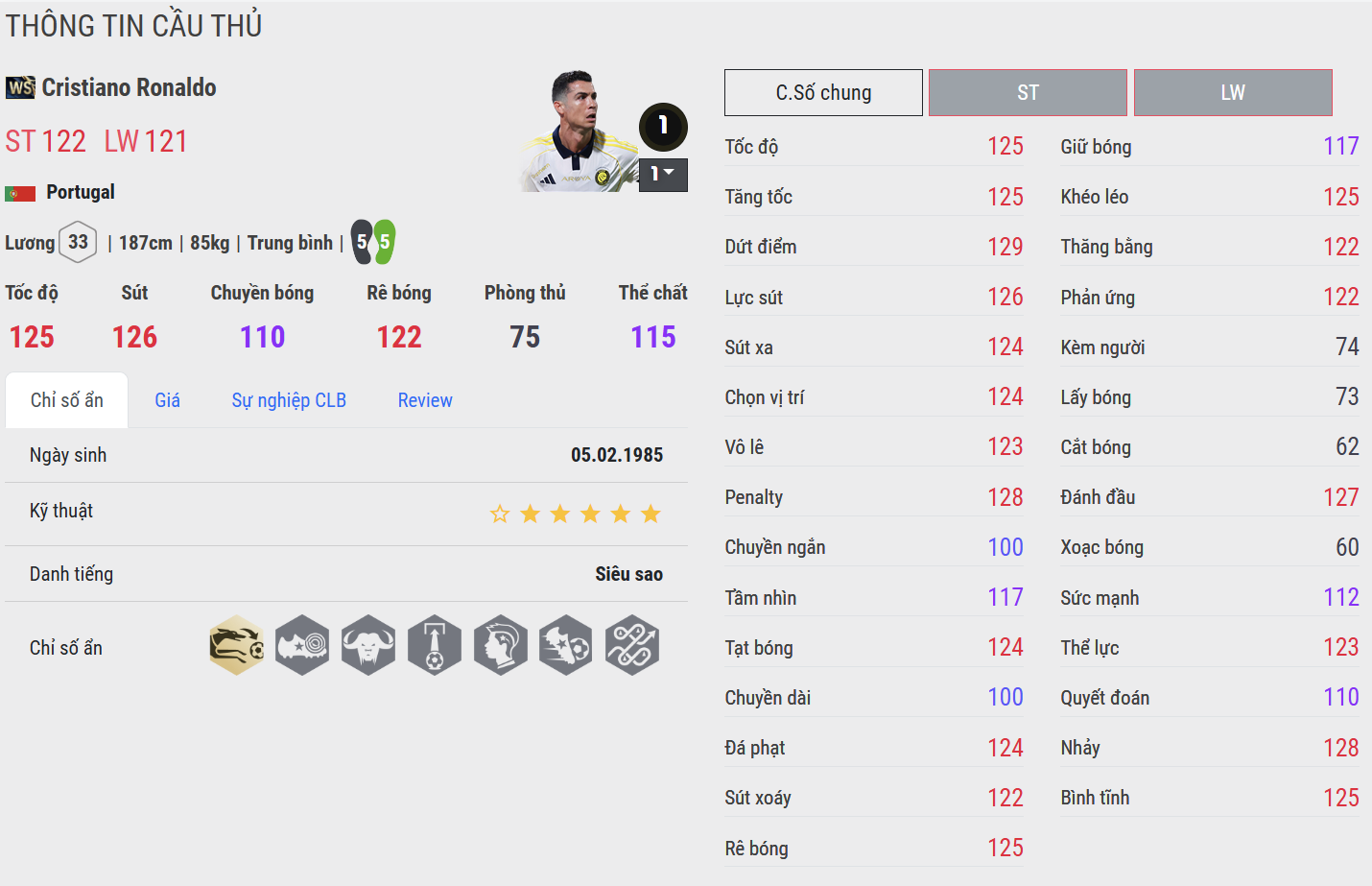 Đứng đầu bảng xếp hạng là CR7 WS – sát thủ toàn diện bậc nhất. Anh sở hữu thể hình lý tưởng, khả năng không chiến vượt trội, tốc độ bứt phá và những cú dứt điểm chuẩn xác. Với CR7 WS, mọi HLV đều có trong tay một quân bài chủ lực có thể định đoạt trận đấu bất cứ lúc nào.