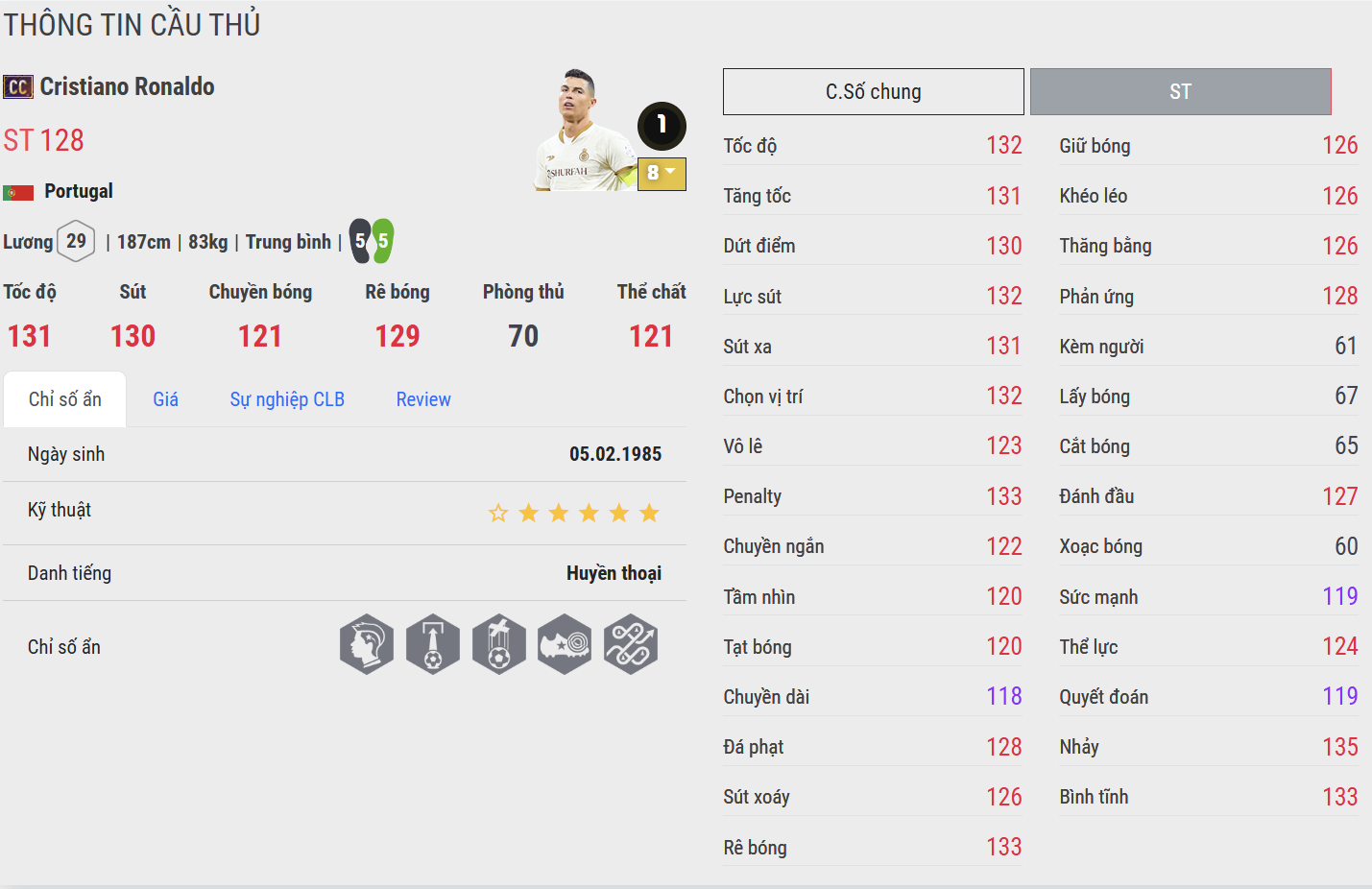 Ronaldo CC vẫn giữ nguyên vị thế biểu tượng của sự toàn diện. Anh mạnh mẽ trong không chiến, tốc độ bứt phá đáng nể và dứt điểm một chạm sắc bén. Trong gameplay, Ronaldo không chỉ là nguồn bàn thắng ổn định mà còn tạo ra nỗi khiếp sợ cho bất kỳ hàng thủ nào.
