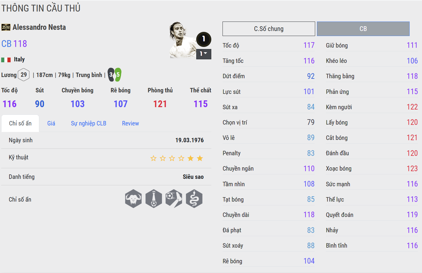 Trong thế giới của những trung vệ huyền thoại, Alessandro Nesta luôn là biểu tượng cho sự thanh thoát và trí tuệ. Ở mùa thẻ 25IM trong FC Online, anh tái hiện hoàn hảo hình ảnh một “thi sĩ phòng ngự” — nơi kỹ năng, cảm quan vị trí và sự điềm tĩnh hòa quyện thành nghệ thuật. Nesta không cần ồn ào hay những pha va chạm dữ dội, anh chặn đứng đối thủ bằng sự tinh tế và đọc tình huống thượng thừa.