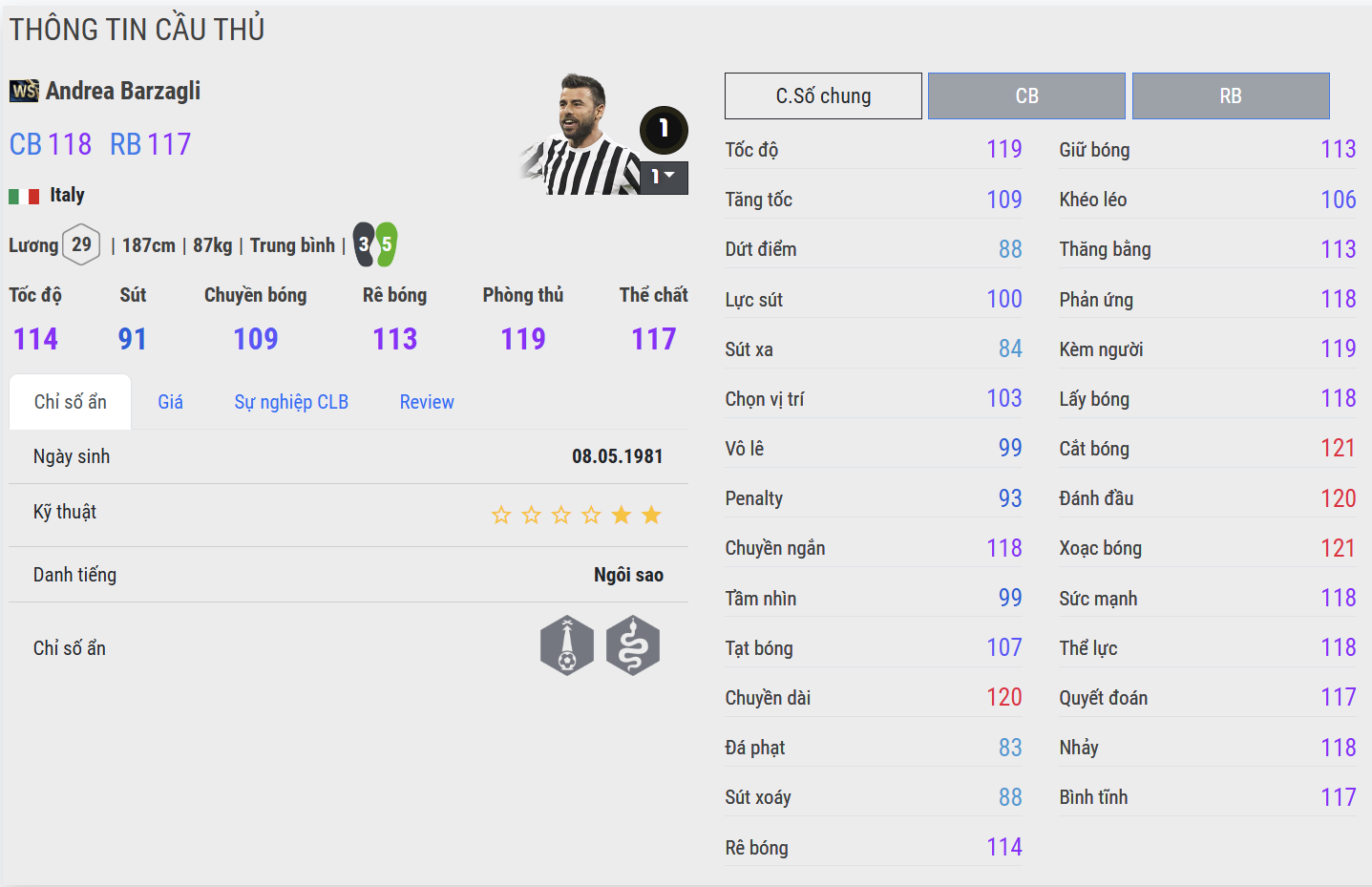 Trong FC Online, Barzagli là lựa chọn lý tưởng cho những HLV tìm kiếm một trung vệ ổn định, đáng tin cậy và thông minh, mang lại cảm giác an toàn tuyệt đối cho hàng thủ. Anh không chỉ giúp ngăn chặn các pha tấn công, mà còn tham gia triển khai bóng từ tuyến dưới, thể hiện đầy đủ phẩm chất của một trung vệ hiện đại – chắc chắn, tinh tế và đầy bản lĩnh.