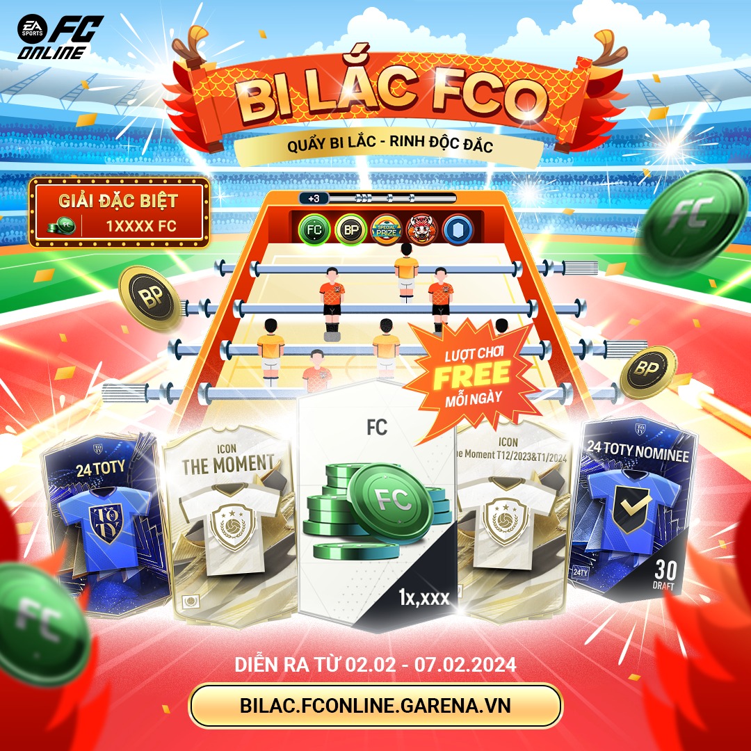 Vào ngày 29 tết âm lịch,FC Online bất ngờ tung ra sự kiện hoàn toàn mới “Song Long FC Online” với giao diện cực bắt mắt, thể thức chơi đơn giản cùng vô số phần quà hấp dẫn không thể bỏ qua trong dịp Tết Giáp Thìn năm nay. Sự kiện còn đem đến lượt chơi miễn phí mỗi ngày, giúp các "nông dân cày chay" có một cái tết no đủ, dễ dàng sở hữu hàng chục nghìn FC, hàng trăm tỷ BP cùng những mùa thẻ mới nhất như 23NG, 24TOTY, 24HR