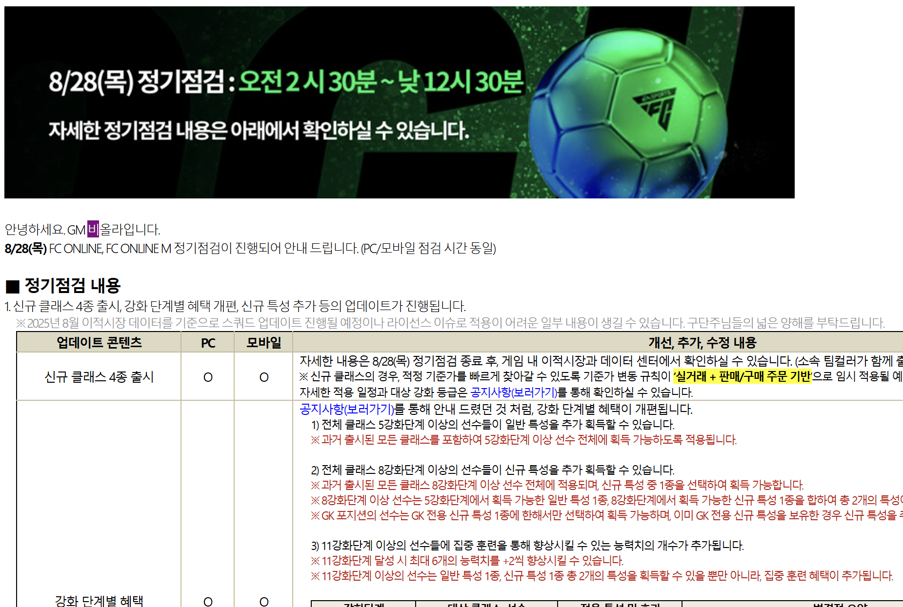 Thông báo từ GM của FC Online Hàn Quốc mới đây đã công bố lịch cập nhật FC Online vào ngày 28/8/2025, đây được xem là một trong những bản cập nhật có rất nhiều những nội dung mới nhằm thay đổi tích cực trải nghiệm người chơi trong FC Online.